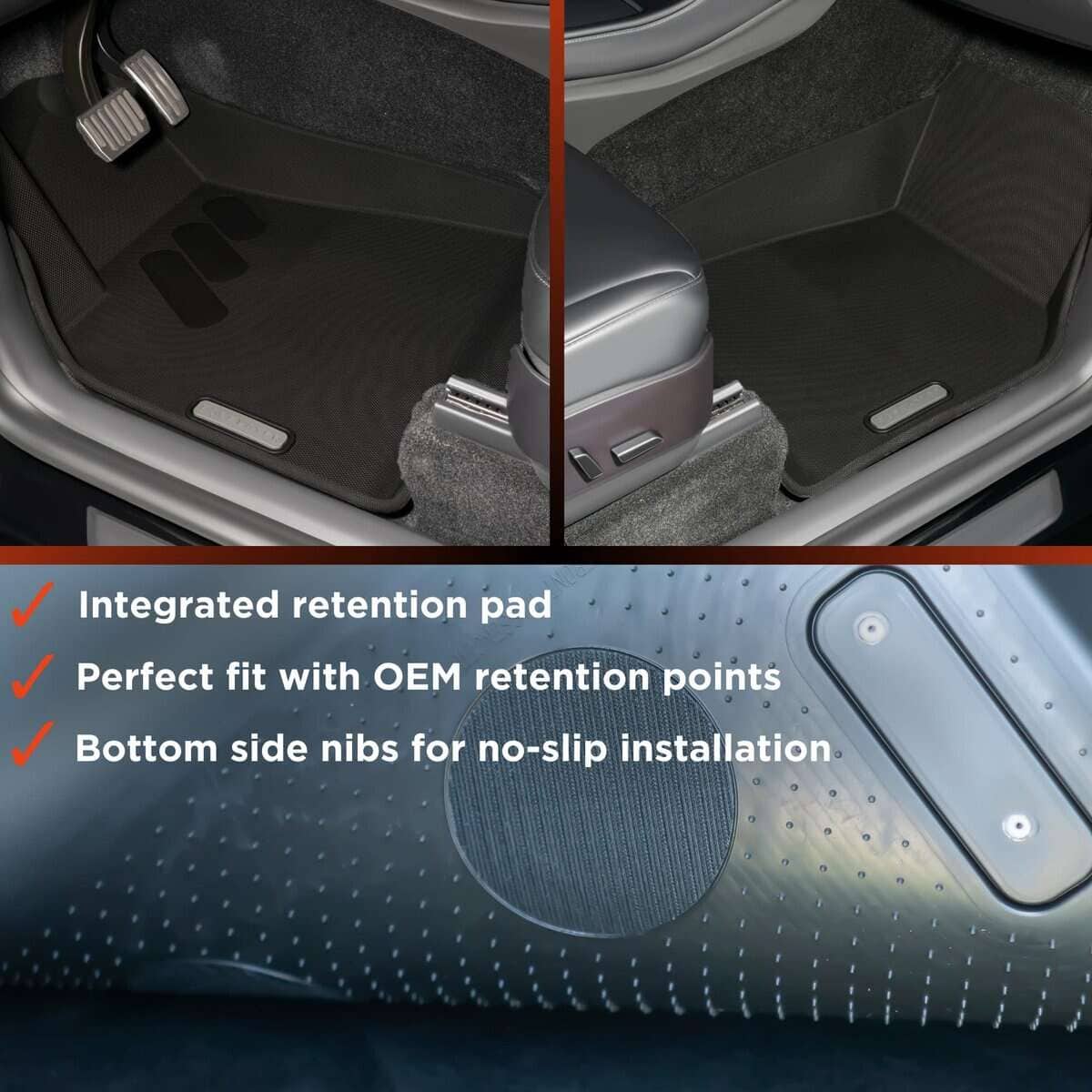 4. SEGURO Instalación rápida y sencilla, no se necesitan herramientas. La seguridad es la máxima prioridad, los tapetes se bloquean a las características de retención de fábrica. El contorno del tapete se ajusta exactamente al perfil del suelo de Tesla. El ajuste de precisión y las características de saliente en la superficie inferior evitan cualquier movimiento al instalarlo.