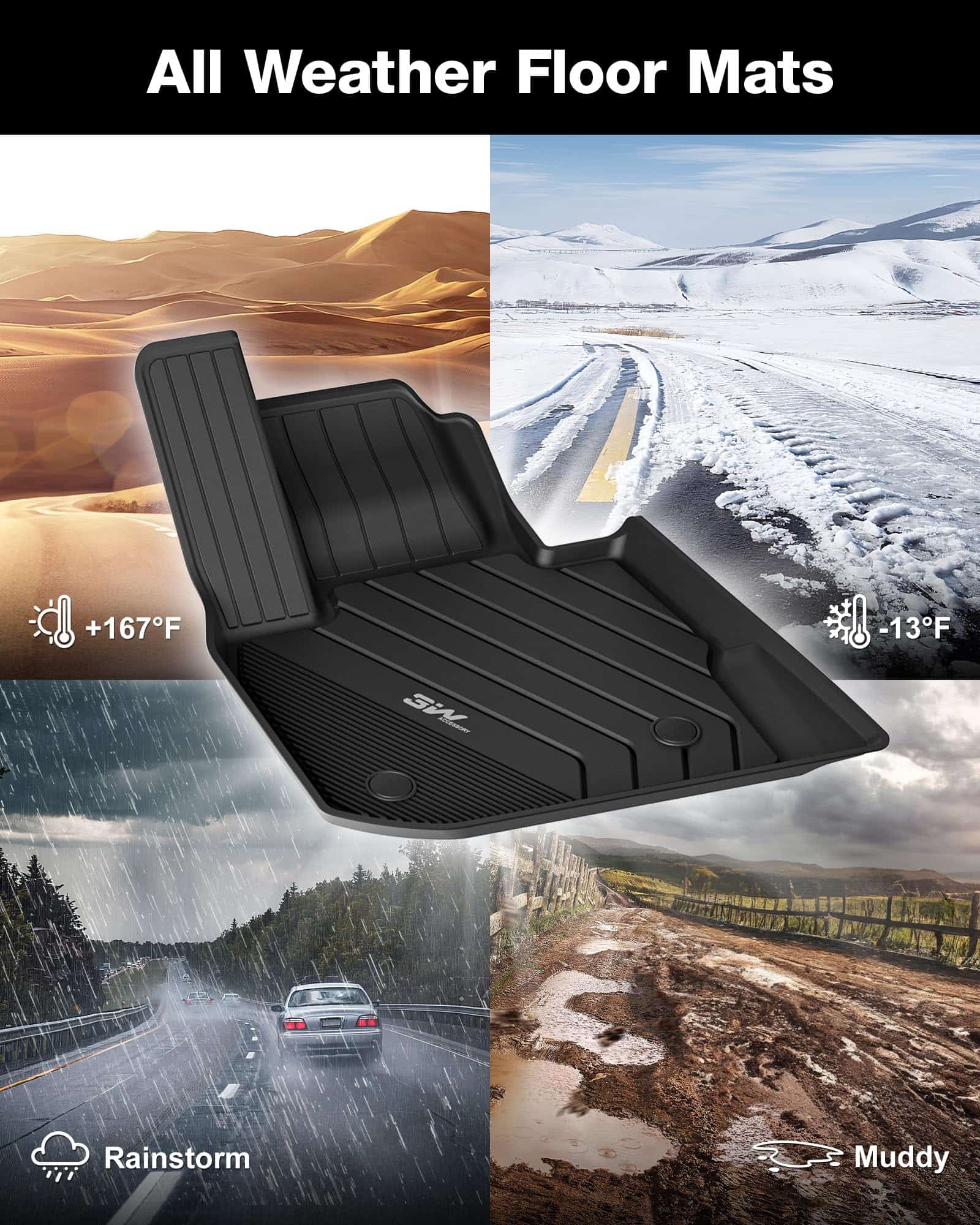 3W Auto Accessory Inc: 3W significa Maravilloso, Mundial, Digno. Somos una empresa que fabrica forros de piso con 25 años de historia. Somos la primera empresa en este campo en utilizar TPE y moldeo por inyección para fabricar forros de piso. Los forros de piso tradicionales se fabrican mediante moldeo por compresión, lo que no permite muchos detalles, lo que hace que los forros de piso sean rígidos y tiesos. Los forros de piso 3W, por otro lado, son resilientes y duraderos. Nuestro moldeo único hace posible diseñar forros de piso con detalles más vívidos. Los forros de piso 3W están diseñados con diferentes patrones que se ajustan al estilo de diferentes modelos de automóviles. Material TPE: Los forros de piso 3W están hechos de elastómeros termoplásticos, que muestran ventajas tanto de materiales de goma como de materiales plásticos, teniendo así más resistencia, elasticidad y durabilidad. Tiene propiedades térmicas y estabilidad de material más sobresalientes cuando se expone a una temperatura extrema. Los forros de piso 3W no tienen olor incluso en climas extremadamente cálidos con todas las ventanas del automóvil cerradas, y pueden mantenerse resilientes en climas extremadamente fríos. Algunos chupetes de bebé están hechos del mismo material. Este diseño ganó el premio Red Dot 2017 en Alemania. Ajuste personalizado y fácil de limpiar: Cada forro de piso 3W es personalizado. Escaneamos el interior de cada automóvil y diseñamos el patrón en computadora incorporando elementos clave del vehículo, brindando a los forros de piso un aspecto y sensación personalizados. Los forros de piso coincidirán perfectamente con el interior de su automóvil. La parte trasera de los forros de piso 3W está diseñada con bolsillos de aire para absorber eficazmente el ruido del chasis. Además, cada forro de automóvil tiene paredes de contención elevadas que protegen su vehículo de todo tipo de desorden. Este diseño especial mantiene barro, nieve, líquidos, escombros lejos del piso de su vehículo. Puede terminar de limpiar los forros de piso en pocos minutos.