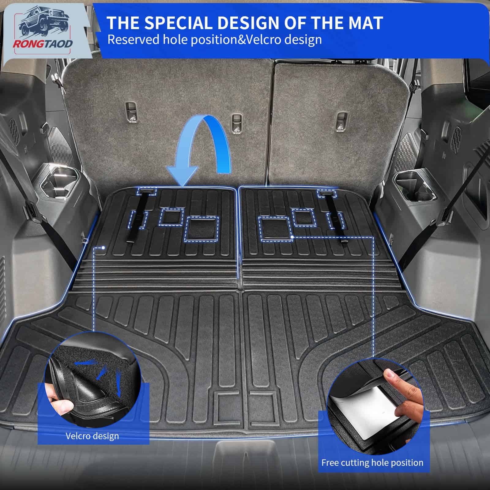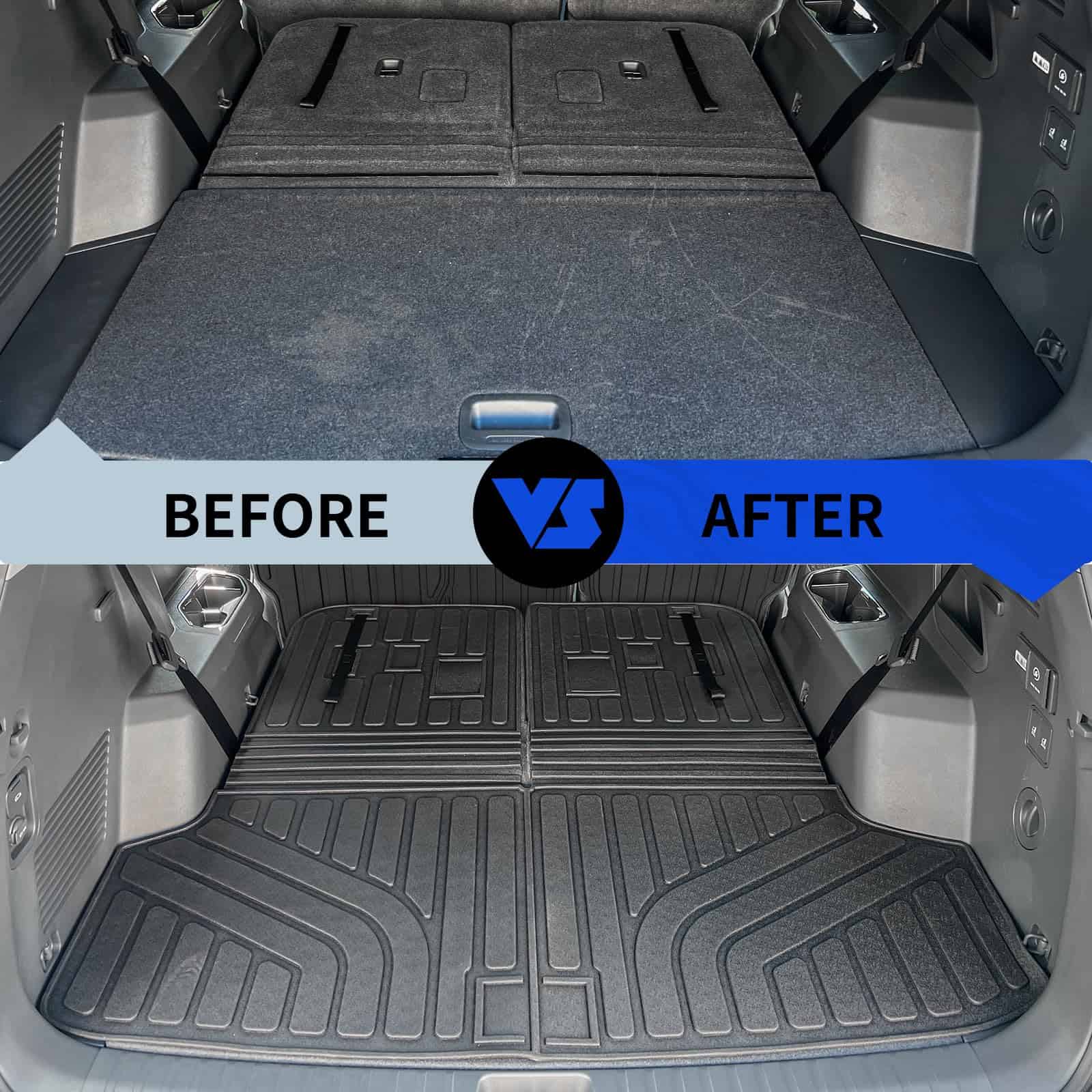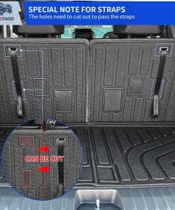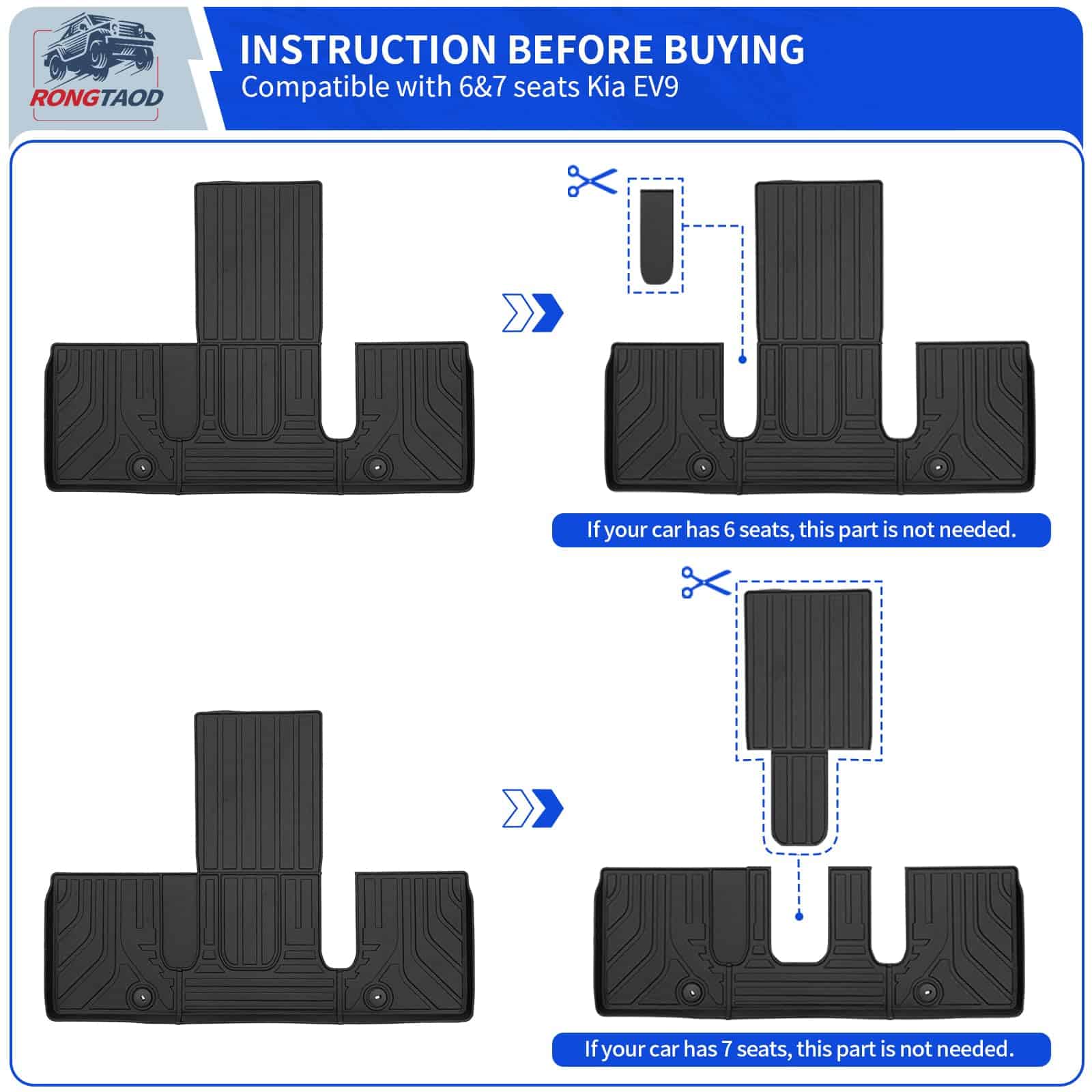 1. Fitment: Basado en el diseño original del vehículo, personalizamos exclusivamente alfombrillas adecuadas para el Kia EV9 6 y 7 Asientos de 2024 2025, que incluyen 1 alfombrilla para maletero con alfombrilla para respaldo y 4 tapetes de piso. Nota: Los tapetes del piso de la 3ra fila deben ser cortados por usted mismo. Por favor, lea atentamente las instrucciones de corte en la imagen principal.
