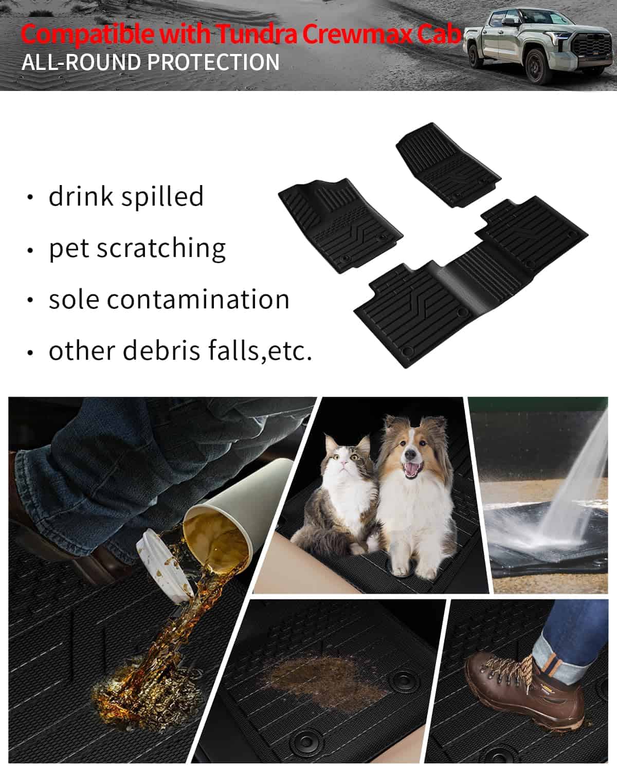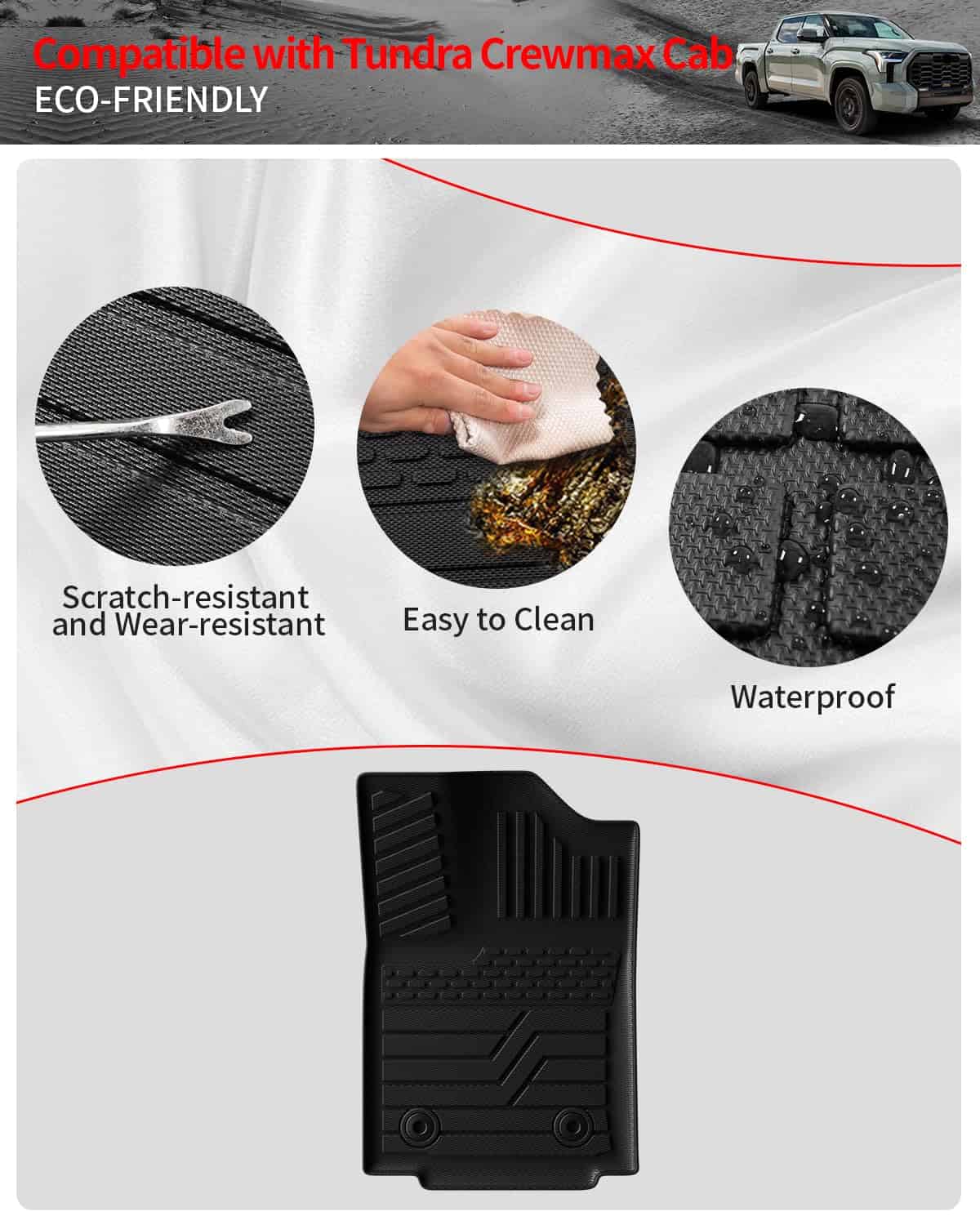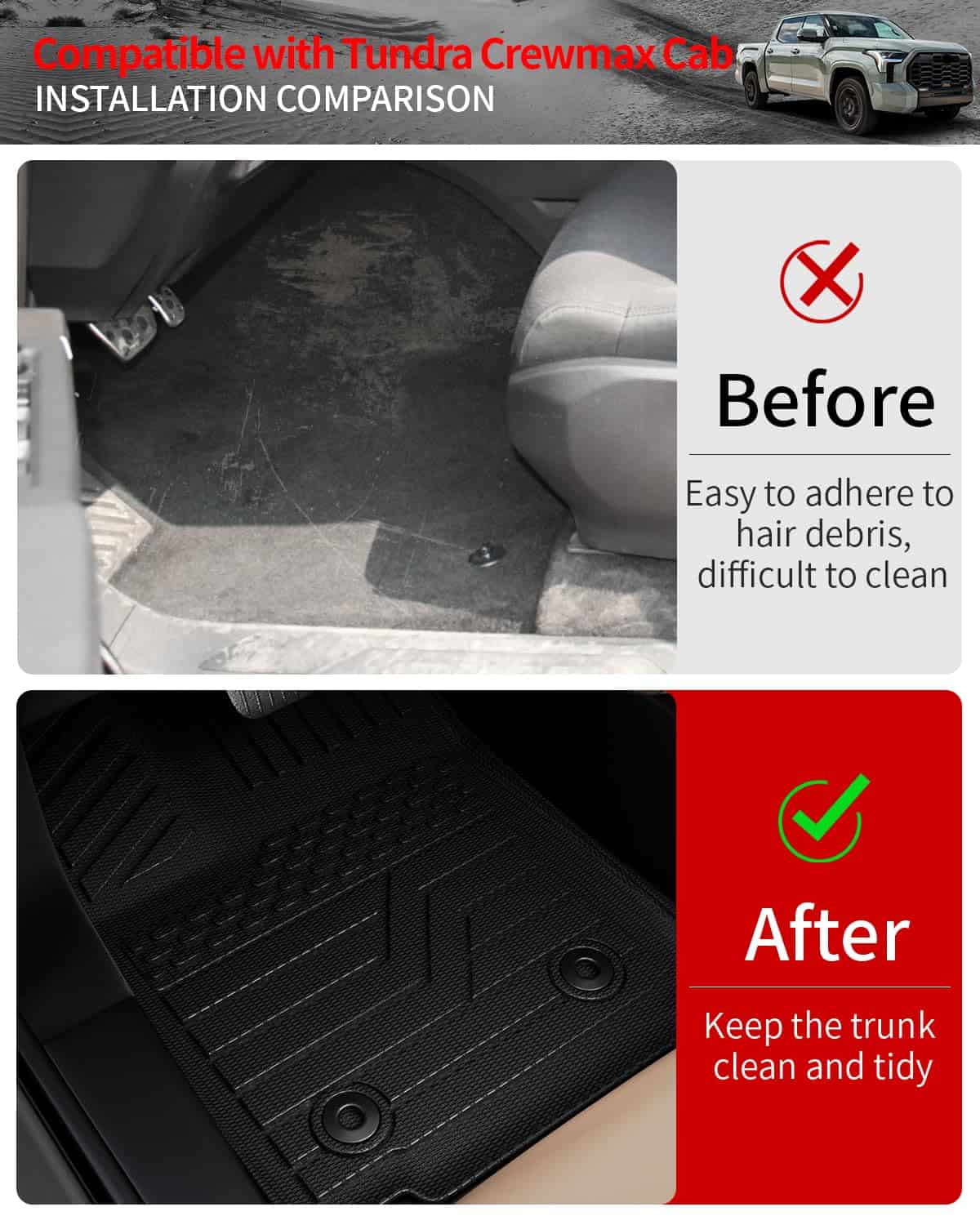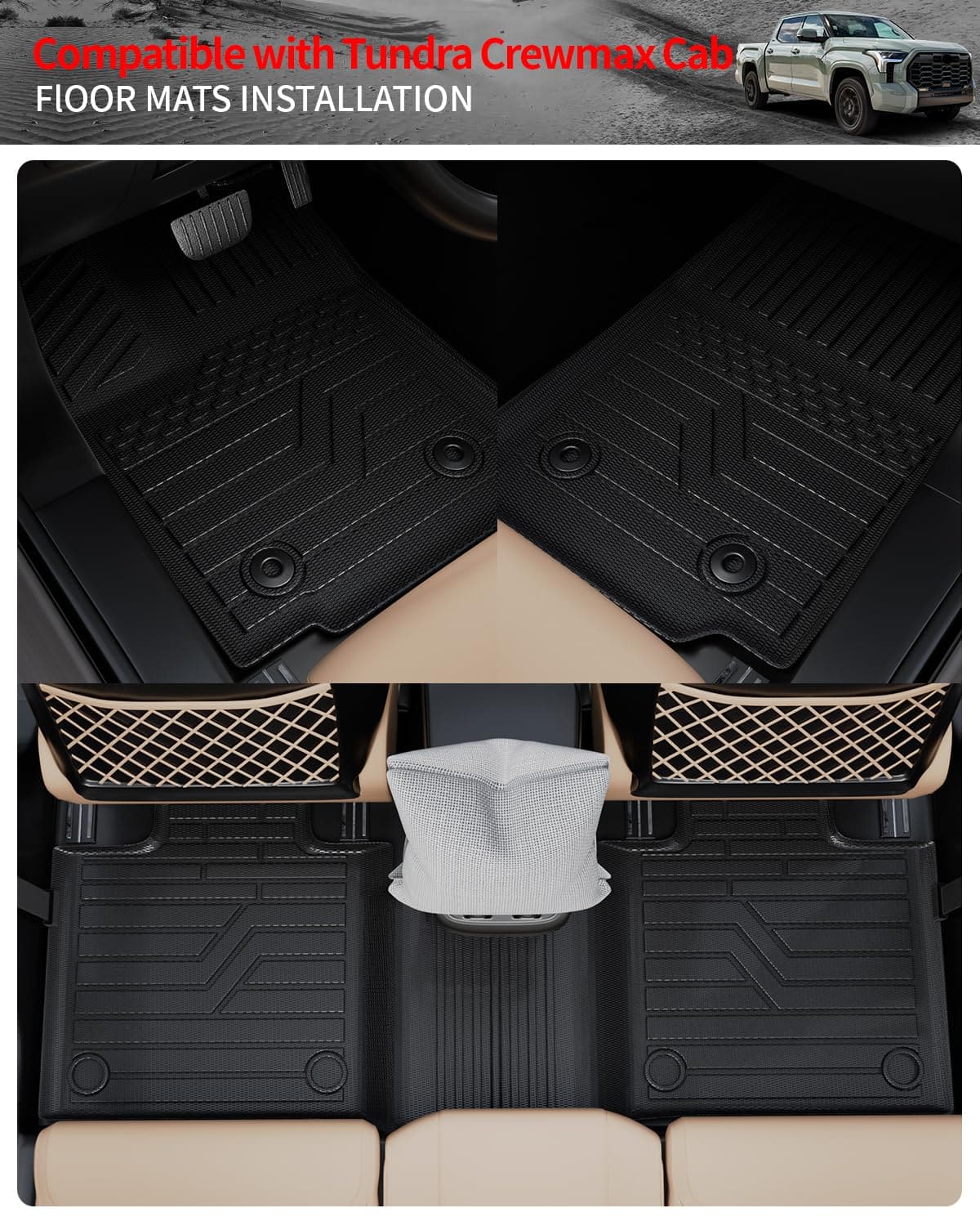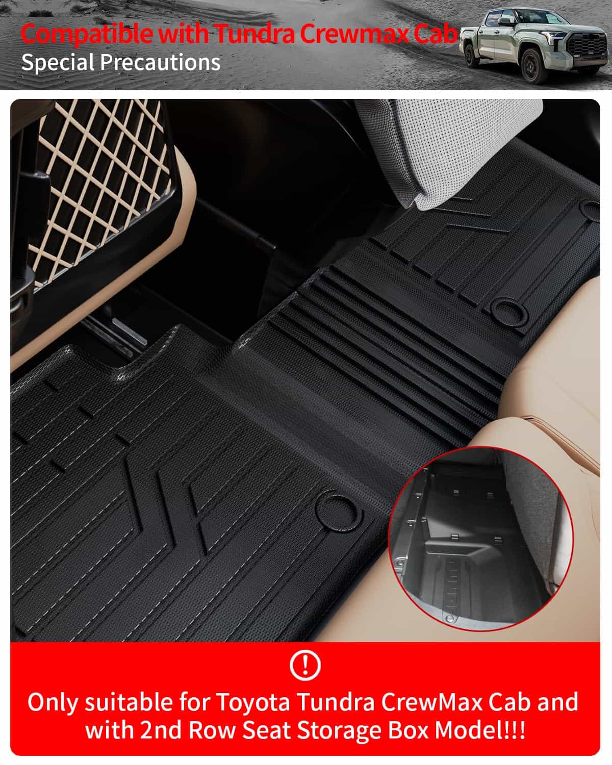 1. Ajuste: De acuerdo con el coche original, tapetes del piso compatibles con 2022 2023 2024 Toyota Tundra de 2 puertas. ¡Solo es adecuado para Toyota Tundra CrewMax Cab y con modelo de caja de almacenamiento de asiento de la 2da fila! Por favor, revise el modelo de su vehículo antes de realizar el pedido.
