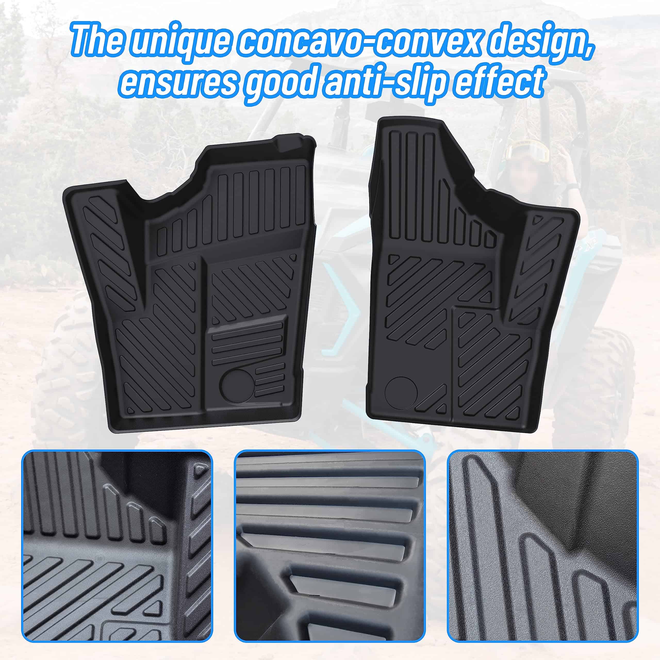 1. PERFECT FIT – Compatible con Polaris RZR XP 1000 2014-2023, Polaris RZR 900 2015-2020, Polaris RZR S 1000 2016-2020, Polaris RZR XP Turbo 2016-2021, Polaris RZR XP Turbo S 2018-2020, Polaris RZR Turbo S 2021; Hecho por escaneo láser digital de precisión única; Ajusta completamente y de forma precisa la alfombra interior.