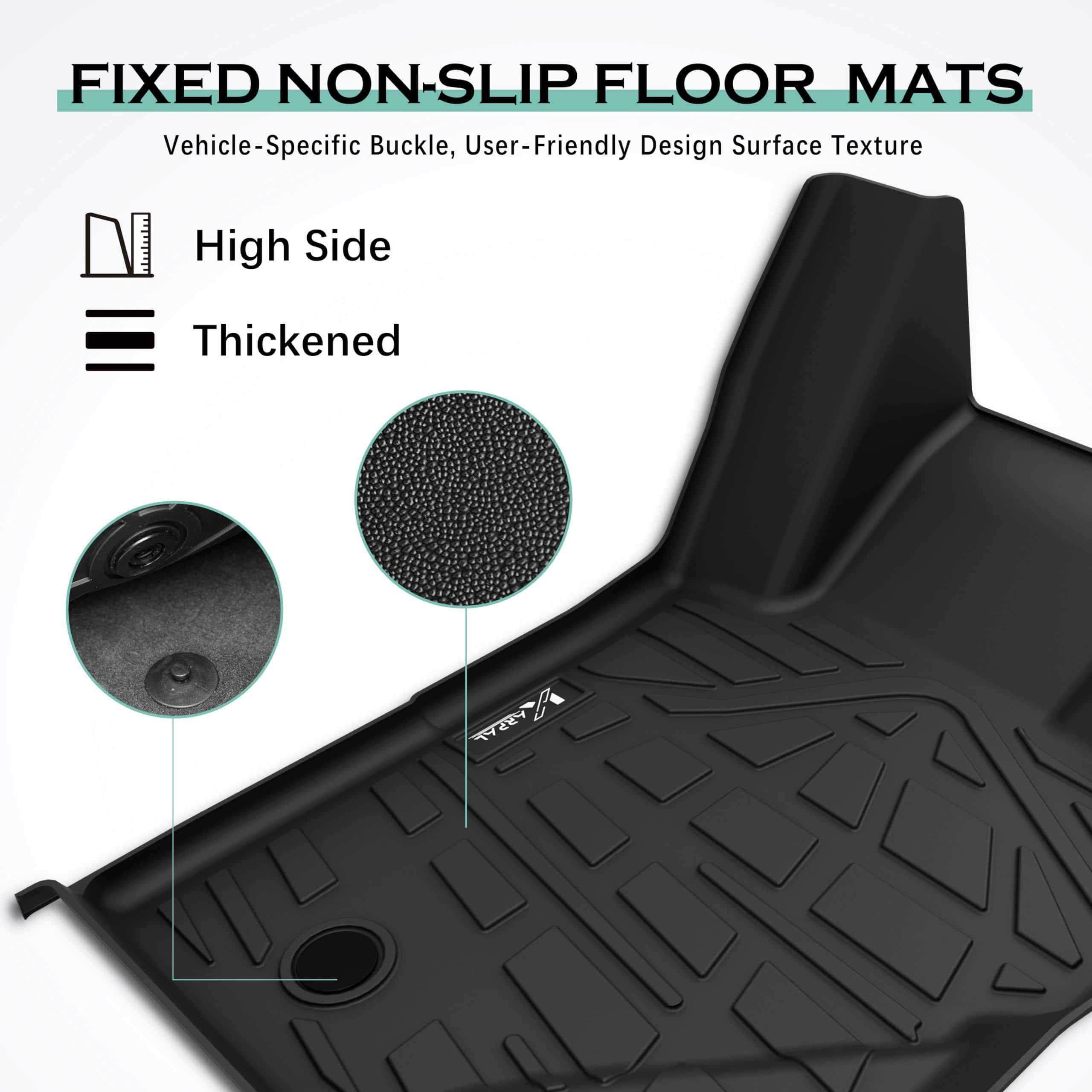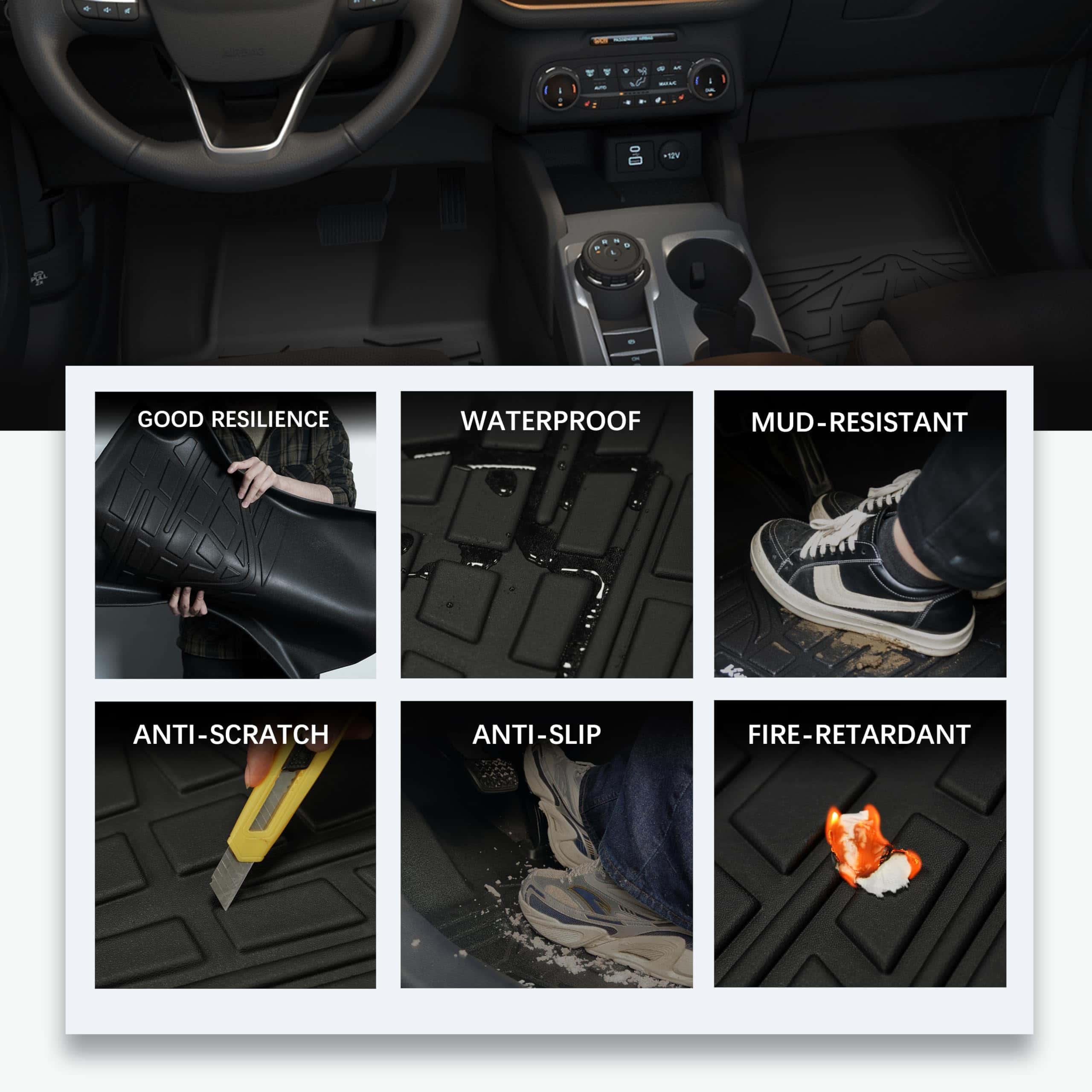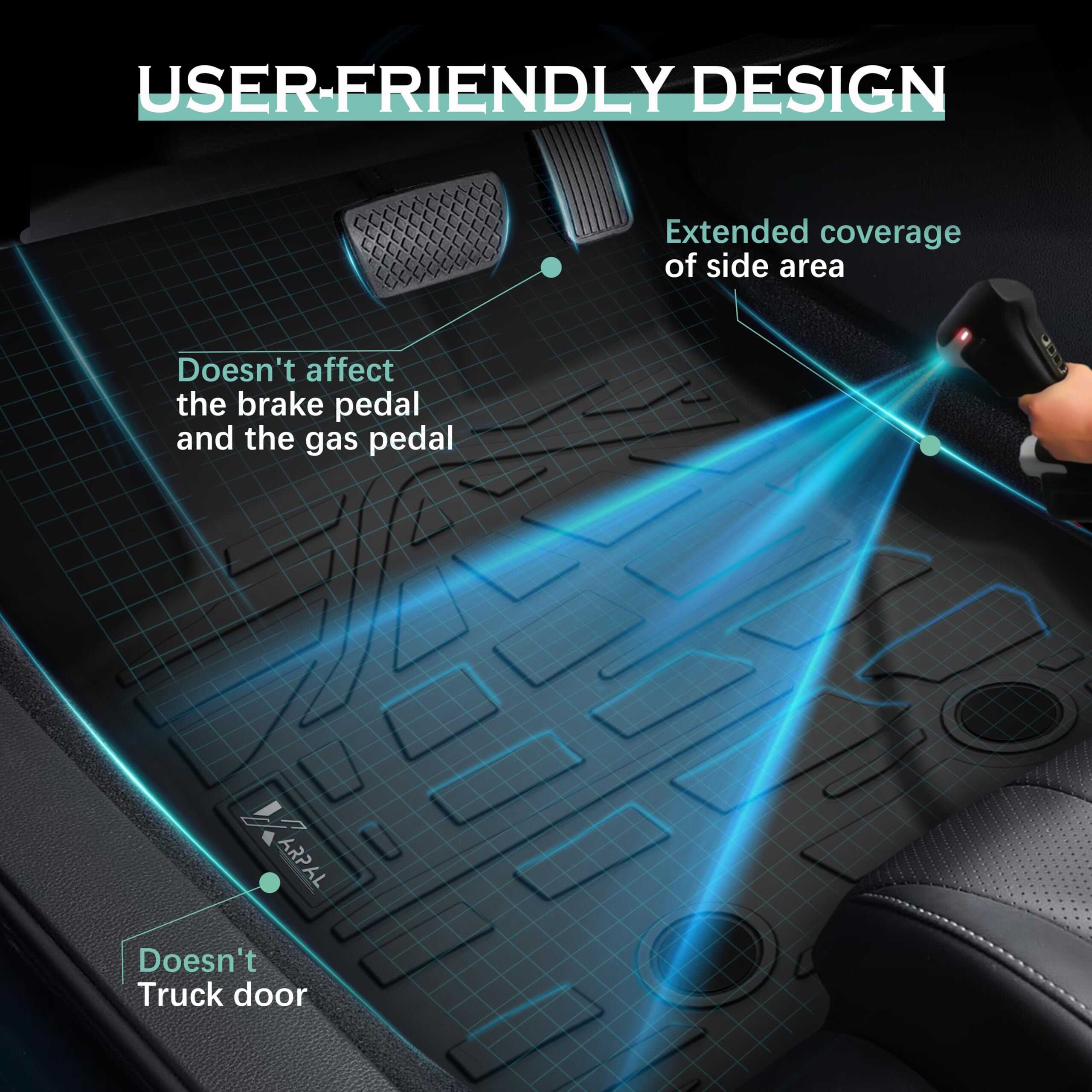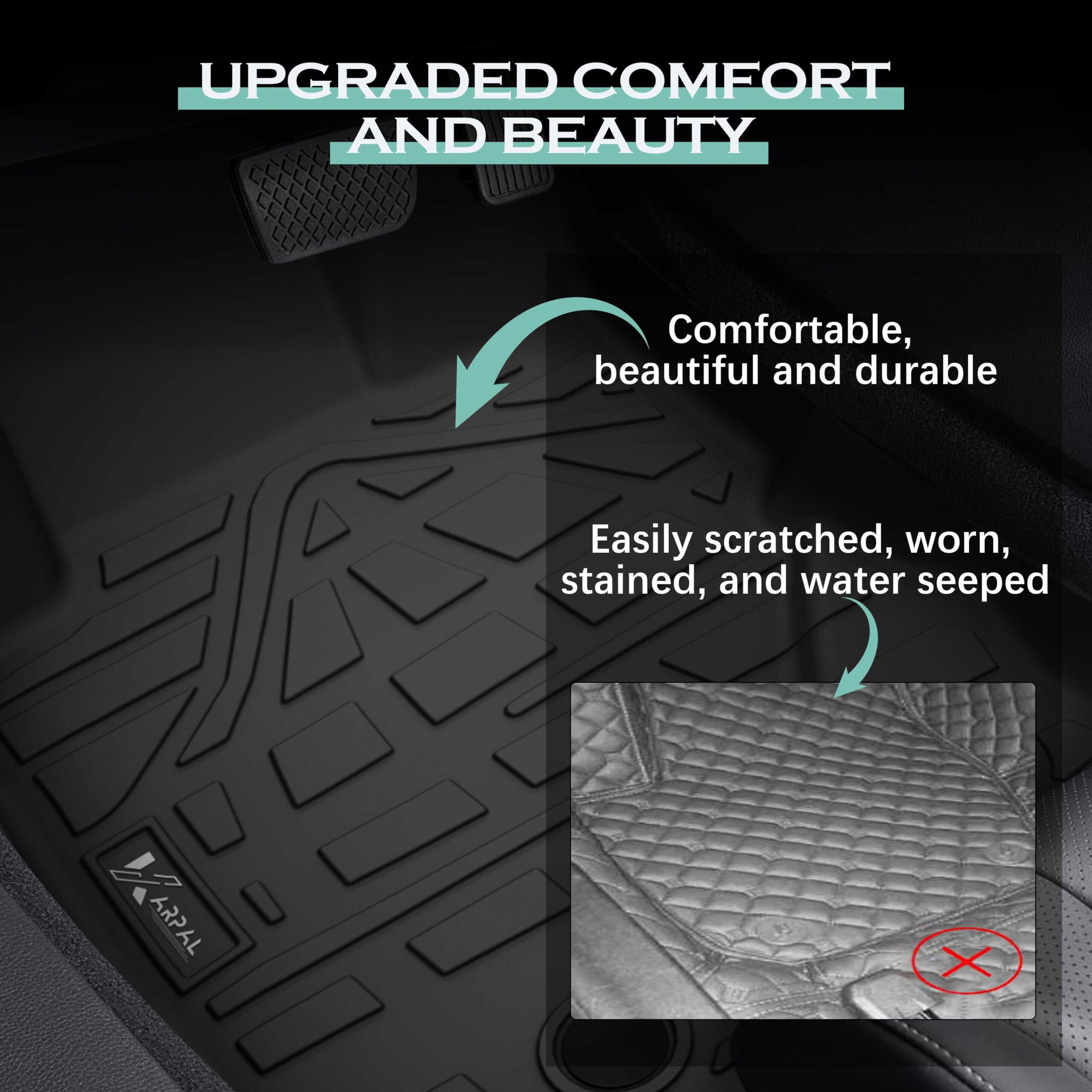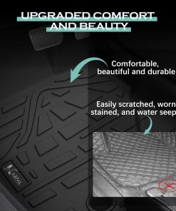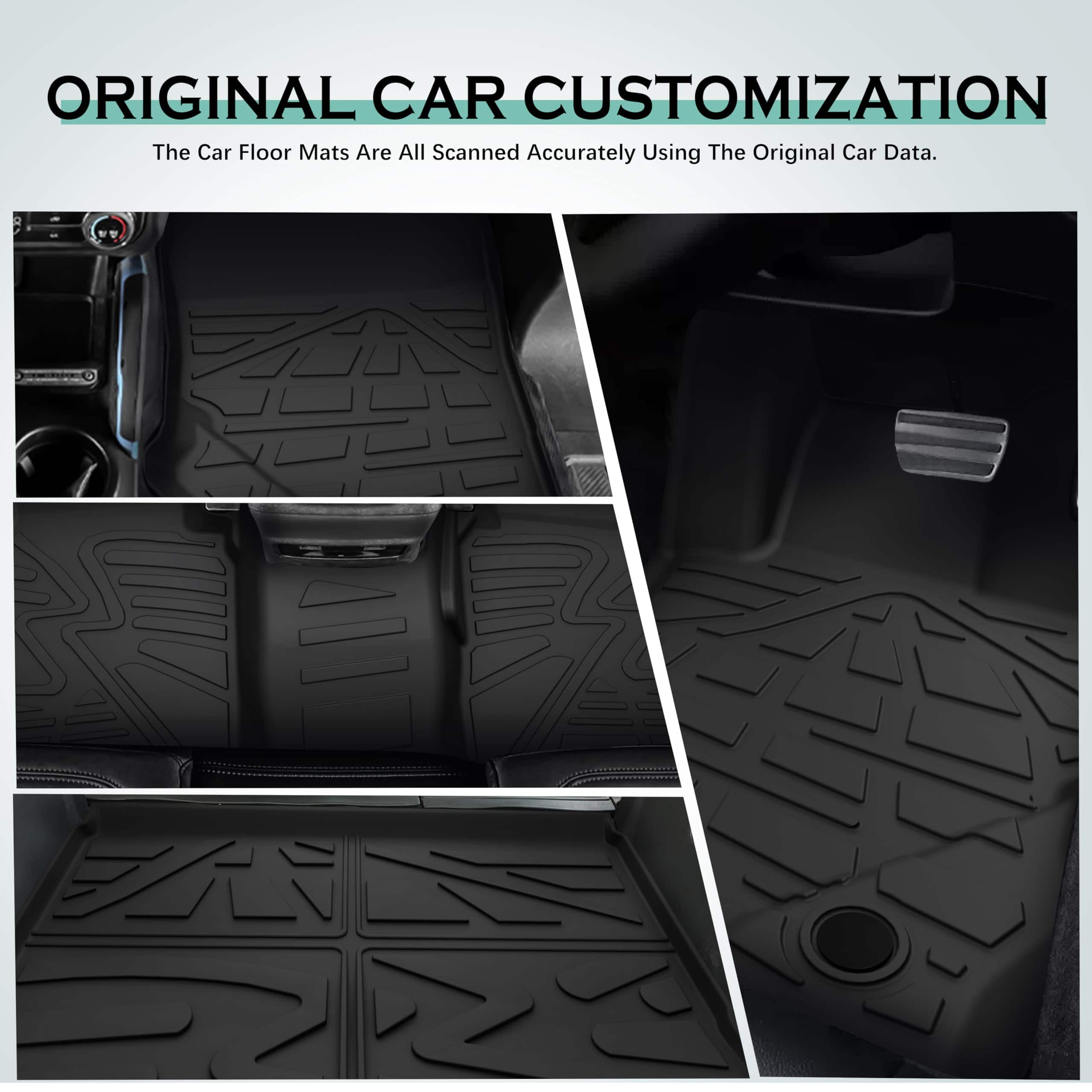 5. FÁCIL DE LIMPIAR: El diseño de instalación y desmontaje sencillo facilita a los usuarios reemplazar los tapetes negros en cualquier momento. Independientemente de la suciedad, derrames o residuos, simplemente límpielos o retírelos para enjuagarlos y mantener fácilmente un espacio de dos filas y maletero ordenado.