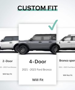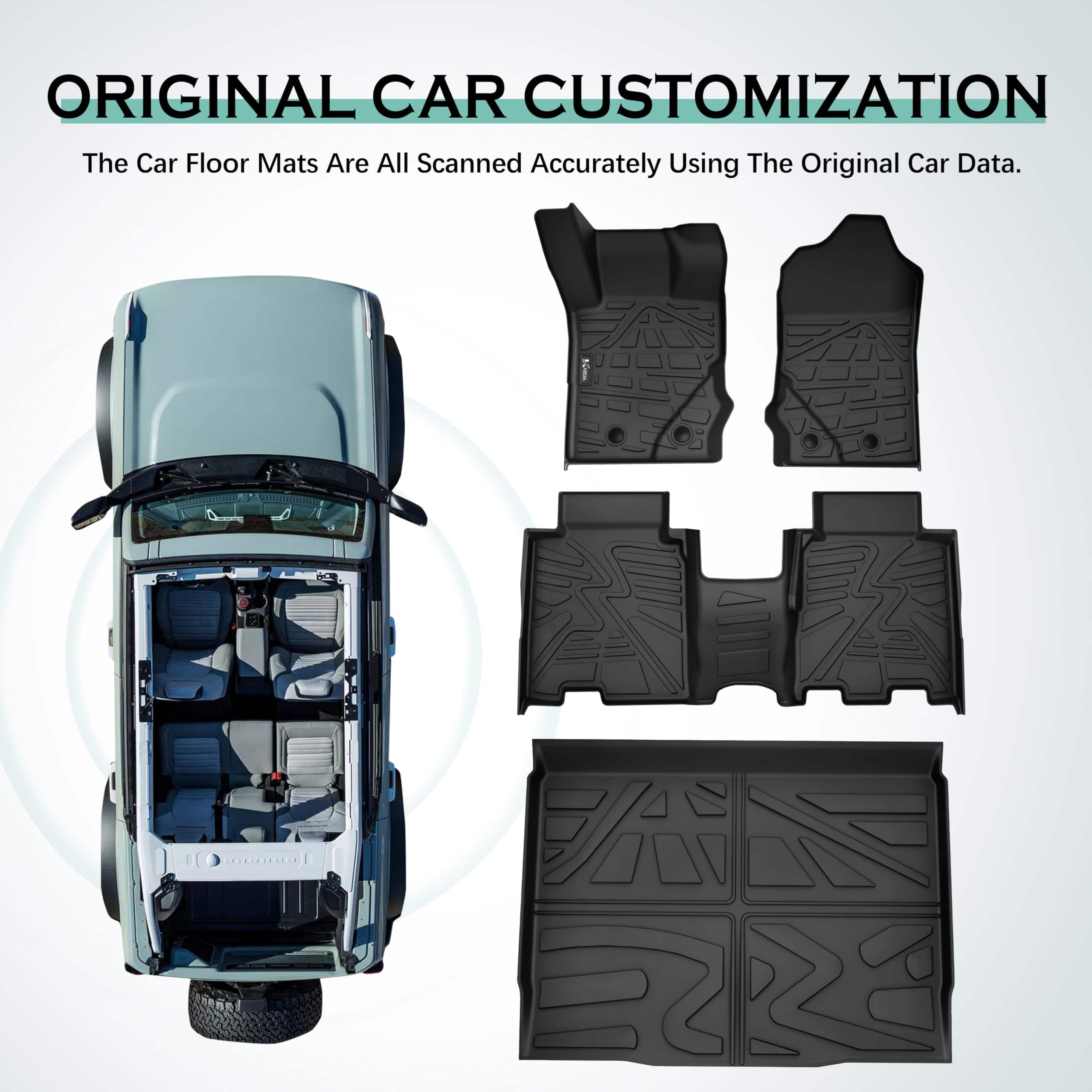1. AJUSTE PERSONALIZADO: Nuestros tapetes son compatibles con el Ford Bronco de 4 puertas de 2021-2024 (No apto para modelos sport). Utilizando tecnología avanzada de escaneo láser 3D y diseño de precisión en el juego de tapetes y protector de maletero, garantizando un ajuste perfecto con el espacio de dos filas y carga del automóvil original y brindando protección integral.