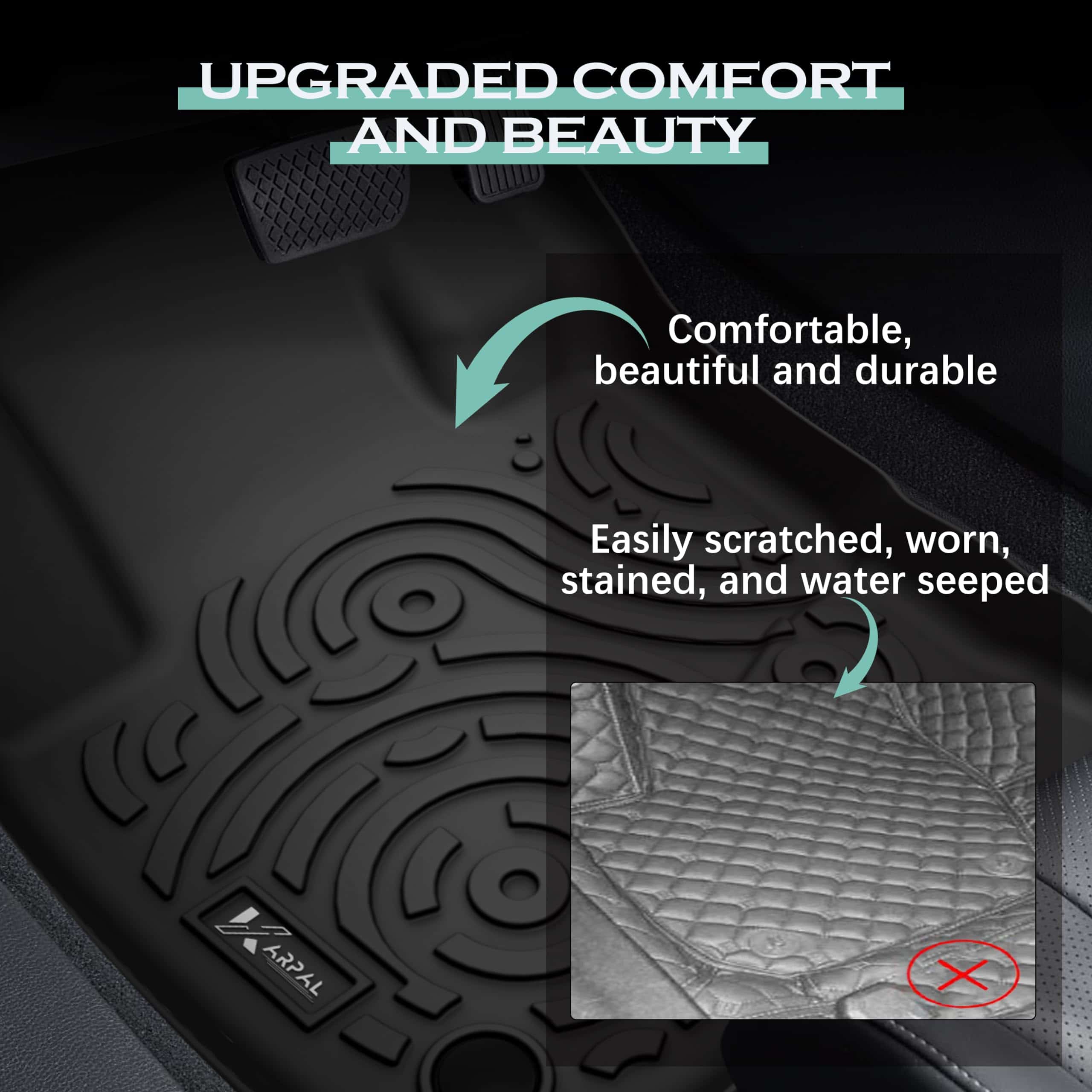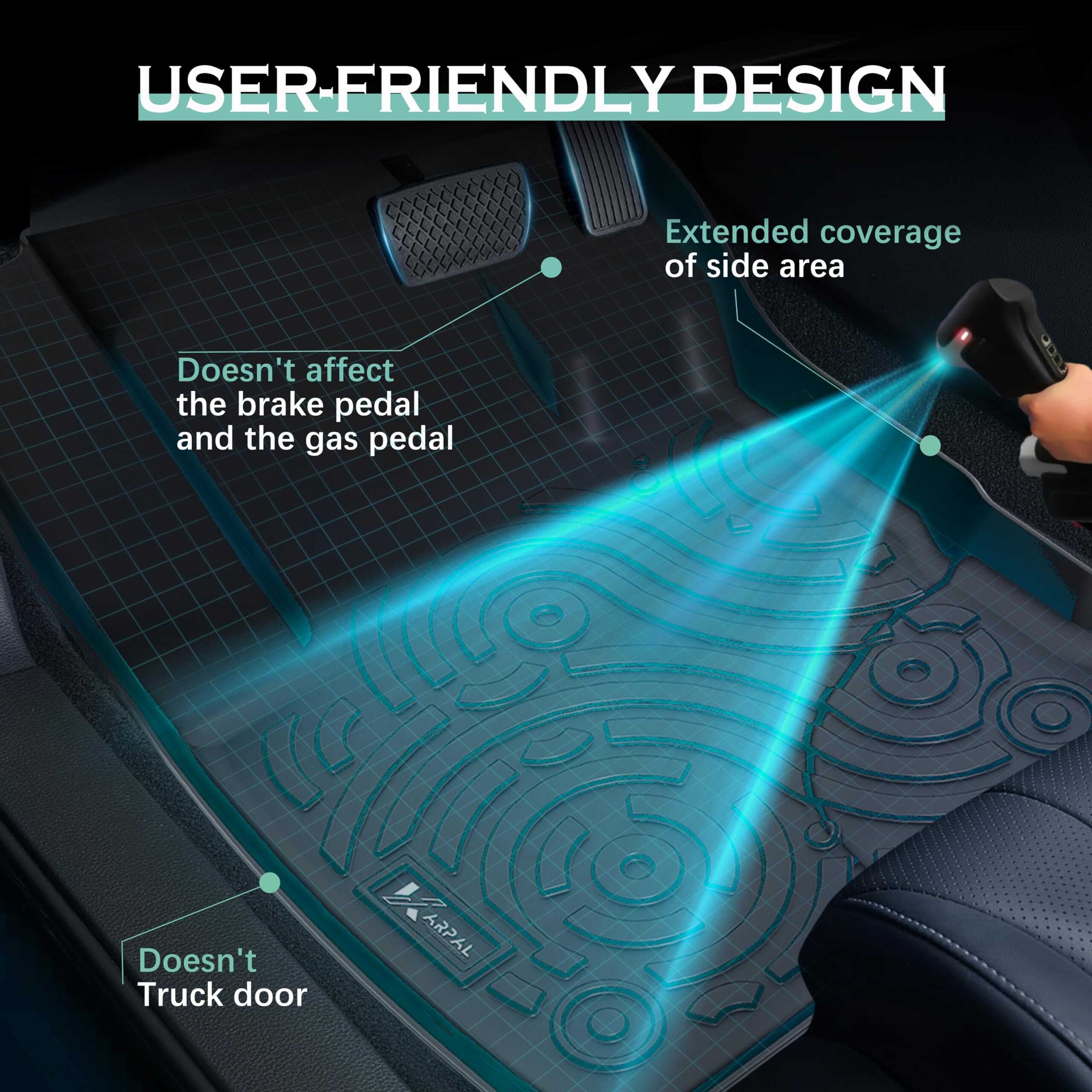 5. FÁCIL DE LIMPIAR: El diseño de instalación y desmontaje sencillo hace que sea fácil para los usuarios reemplazar los tapetes de piso negros en cualquier momento. Independientemente de la suciedad, derrames o desechos, simplemente límpielos o retírelos para enjuagarlos y mantener fácilmente un espacio limpio de dos filas y maletero.