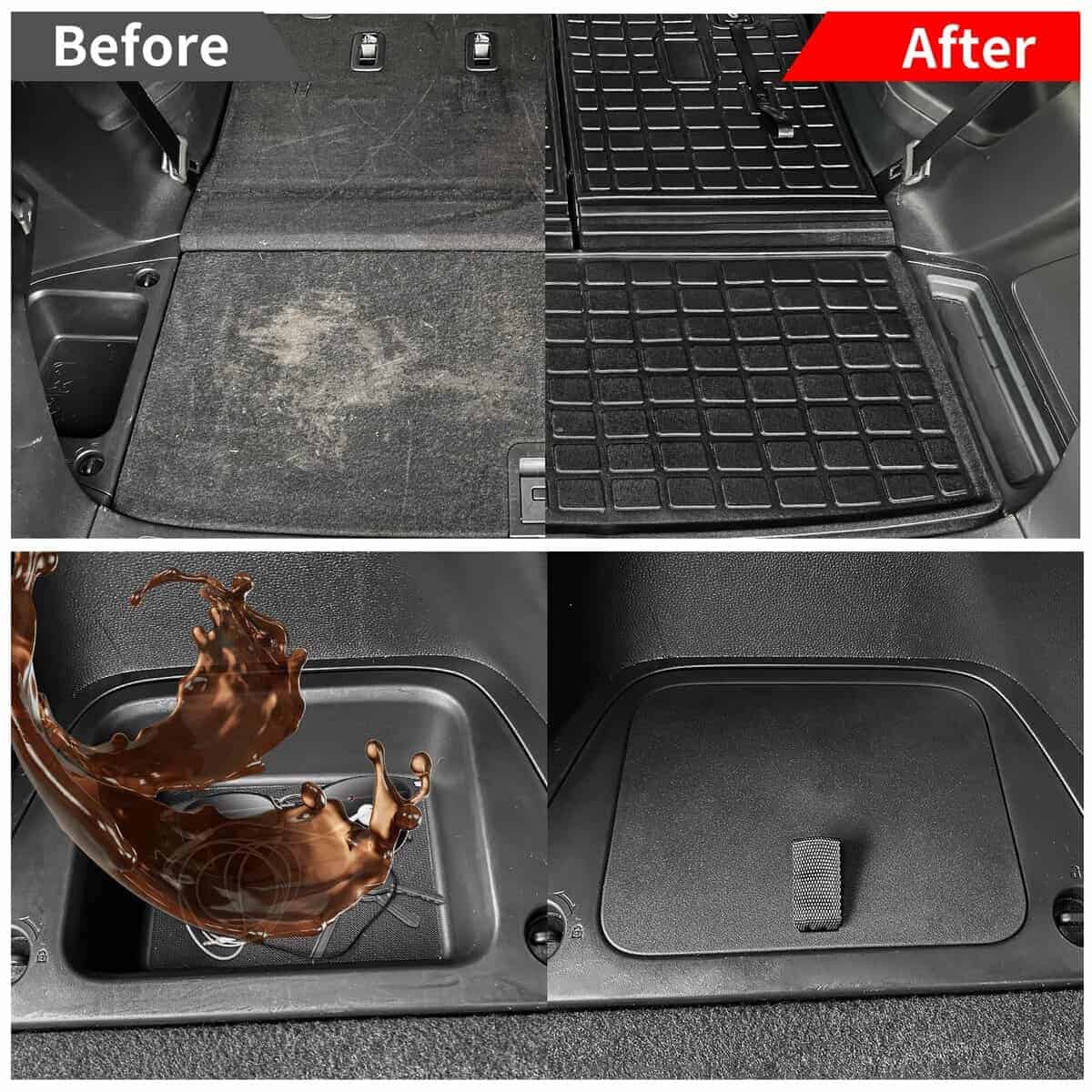 2. Función: Esta alfombra de maletero de TPE ofrece protección contra derrames, arena, nieve y cualquier otra suciedad, con esta alfombra no necesitas preocuparte por dañar tu alfombra original. La cubierta del almacenamiento lateral del maletero puede proporcionar un espacio de almacenamiento seguro y privado.