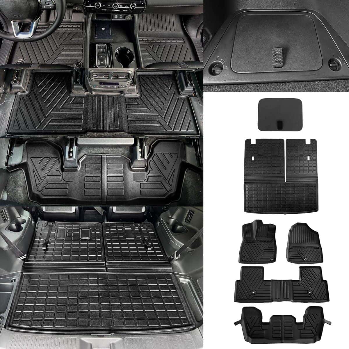 1. Diseño: Según el diseño original del automóvil, nuestras alfombras y cubiertas de maletero son adecuadas para Honda Pilot 2023 2024 2025, incluyendo 1 alfombra de carga con alfombra de respaldo, 4 alfombras y 1 cubierta de organizador de maletero.