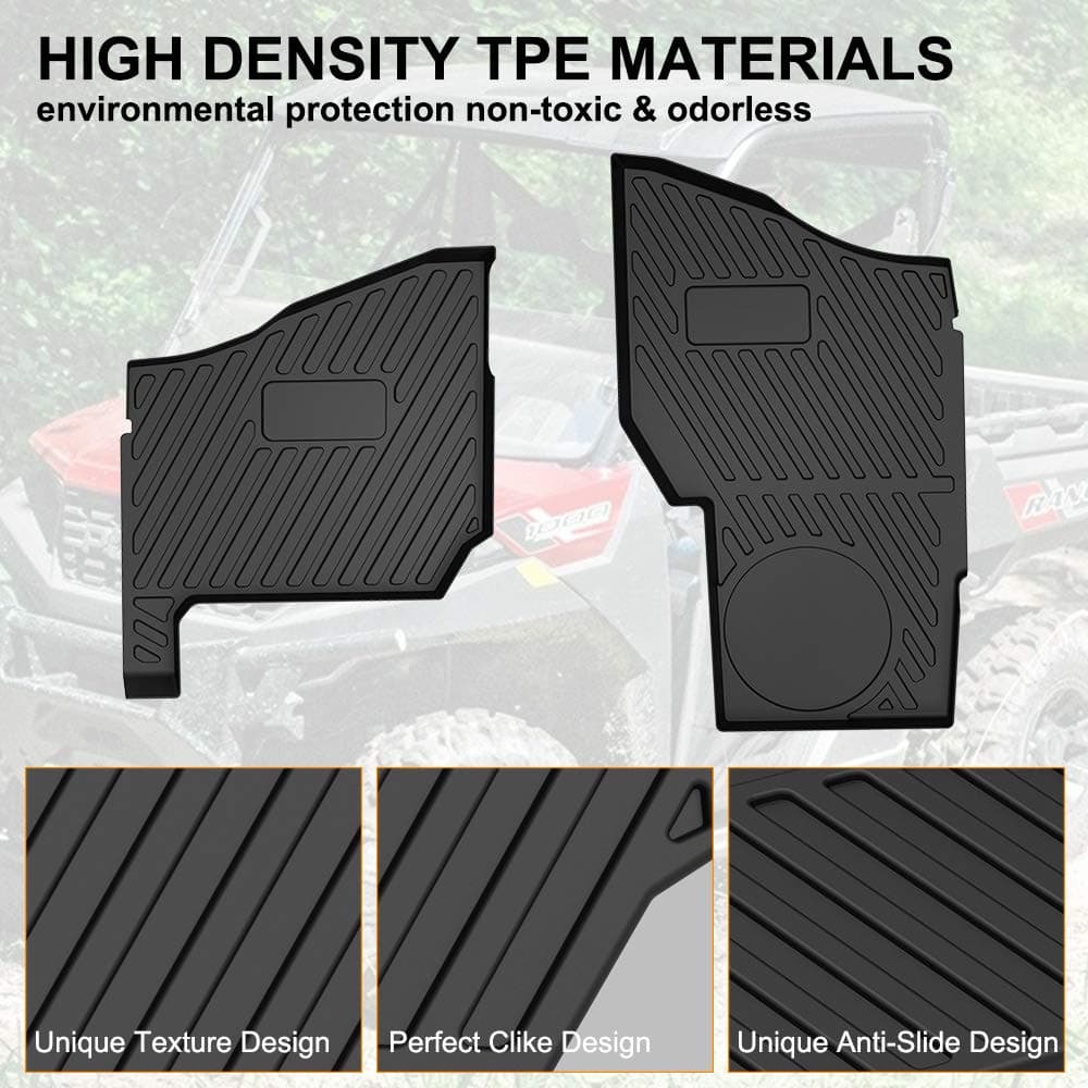 Los tapetes KIWI MASTER protegen los pisos del conductor y el pasajero del vehículo. Hechos de material TPE, estos tapetes resistirán los elementos duros, evitando manchas y humedad en las alfombras originales de fábrica. Límpielos fácilmente con jabón y agua caliente o fría y un cepillo suave, no es necesario frotar con dureza ni usar limpiadores especiales. El respaldo especial antideslizante evitará cualquier deslizamiento o movimiento al contacto. Mantenga su enfoque en su conducción y no en ajustar sus tapetes para auto, mantenga el piso de su automóvil en condiciones impecables fácilmente, desde la marca confiable de accesorios automotrices. Especificaciones: Color: Negro Material: TPE Peso de envío: 6.6 LBS Dimensiones de embalaje: 31.5 x 22.0 x 3.5 pulgadas Compatibilidad: Compatible con Polaris Ranger XP 1000 2018-2020 Compatible con Polaris Ranger XP 1000 CREW 2019-2020, SE AJUSTA SOLO EN LA PARTE FRONTAL (NO es compatible con los modelos Ranger 1000 XP 2020) Paquete Incluido: 1 Set de Tapetes para Polaris Ranger XP 1000 2018-2020
