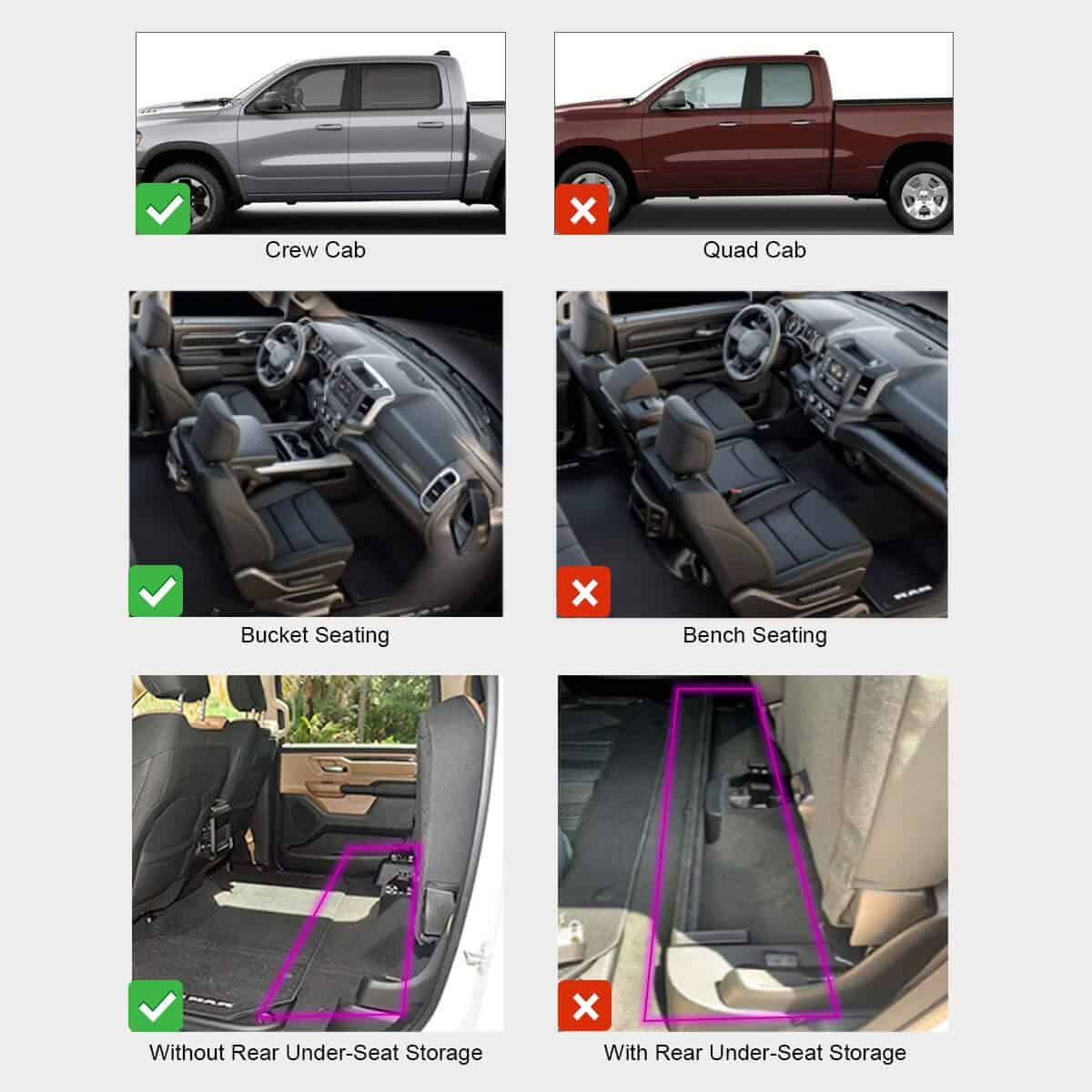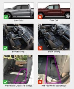 Los tapetes LASFIT son un concepto personalizado irrompible para los vehículos y no es sorprendente que tengamos tapetes de piso bastante durables y de buena cobertura para nuestros clientes. Nos enfocamos en proporcionar productos de alta calidad, un excelente servicio al cliente a un precio competitivo para nuestros clientes en los Estados Unidos. Lo único que obtendrá son los tapetes de piso de cobertura total y ajuste personalizado. Los tapetes de piso de cobertura total son lo suficientemente grandes como para mantener la nieve, la lluvia y el barro alejados de la alfombra interna. Es bueno para contener el desorden de los zapatos mojados o sucios, sin importar en qué pise. Razones para elegir los tapetes de piso LASFIT: Ajuste personalizado para Ram Pickup 1500 Crew Cab 2019-2020, con asientos de cubo de 1ra y 2da fila únicamente y sin almacenamiento debajo del asiento trasero. Más asequible en comparación con otras marcas. Fácil de limpiar y mantener, suave y resistente. Cobertura total para todas las estaciones y climas. Mantenga su alfombra limpia y brinde la sensación más cómoda. Todos los productos de LASFIT Floor mats-USA están meticulosamente diseñados y personalizados para adaptarse exactamente a cada automóvil.