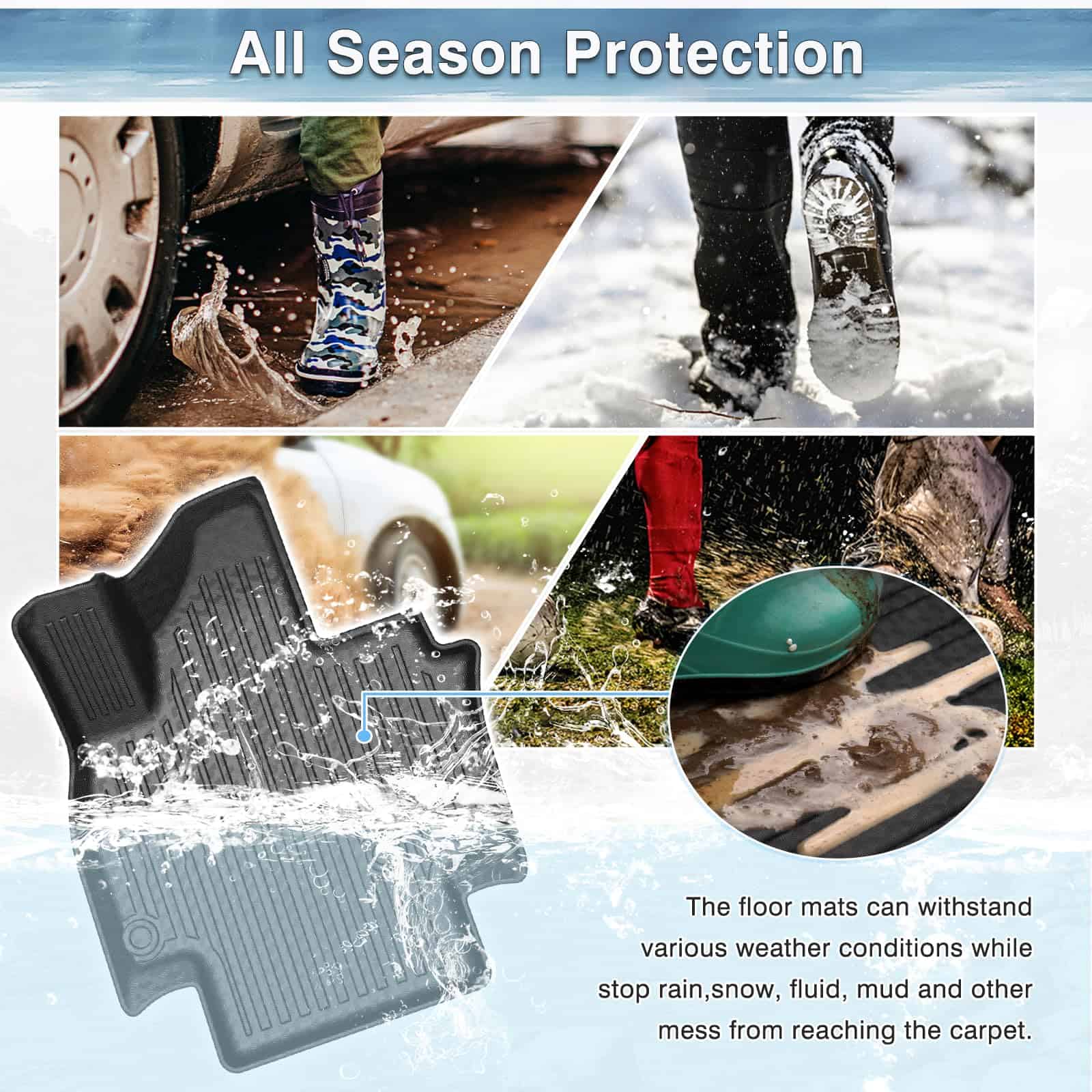 2. Material TPE Todo Clima y Seguro: Los tapetes están hechos de materiales TPE que son impermeables, duraderos, resistentes al desgaste, antideslizantes y sin olor. El material TPE de alta densidad y seguro mantiene su flexibilidad en todas las estaciones mientras ofrece una excelente sensación y una resistencia extrema al desgaste.