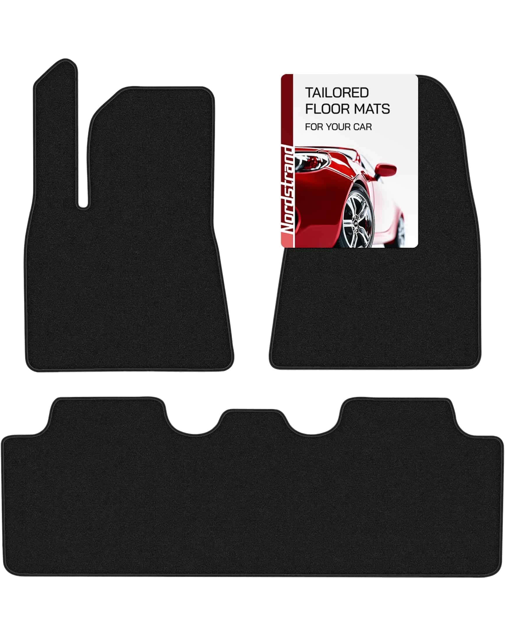 Set de 3 tapetes negros para Tesla Model 3 (2 delanteros, 1 trasero) por Nordstrand. Ajuste personalizado en 3D para Tesla Model 3 2017 2018 2019 2020 2021 2022 2023. Hecho a mano con resistente alfombra de 30oz y ribete protector. Base antideslizante de nylon para reducir ruido en carretera y evitar movimientos no deseados. Los tapetes Nordstrand para Tesla Model 3 brindan protección en todo tipo de clima y son fáciles de limpiar.