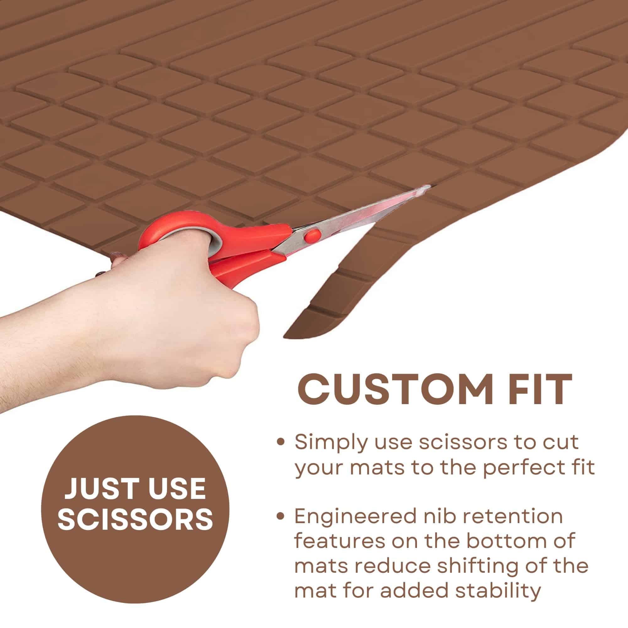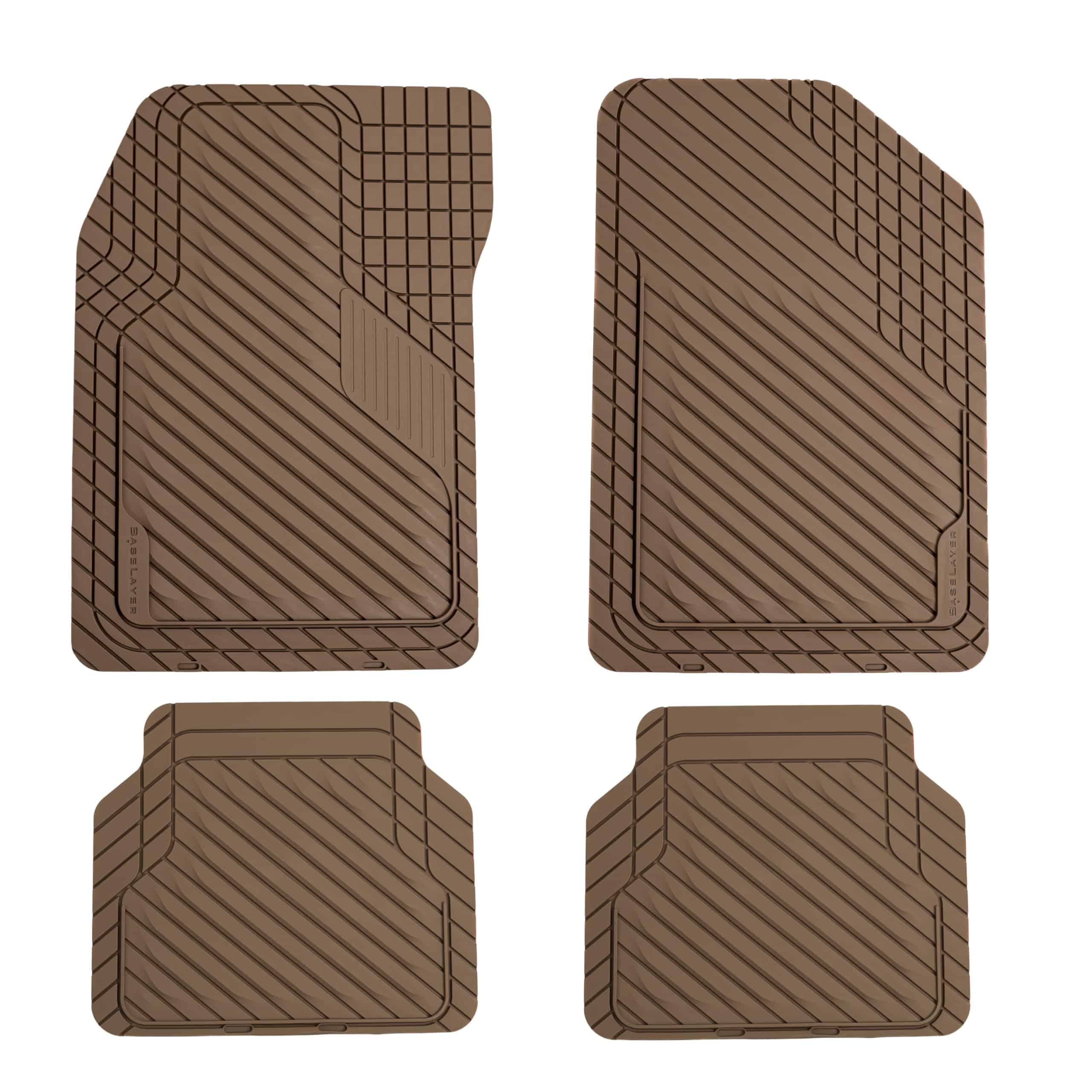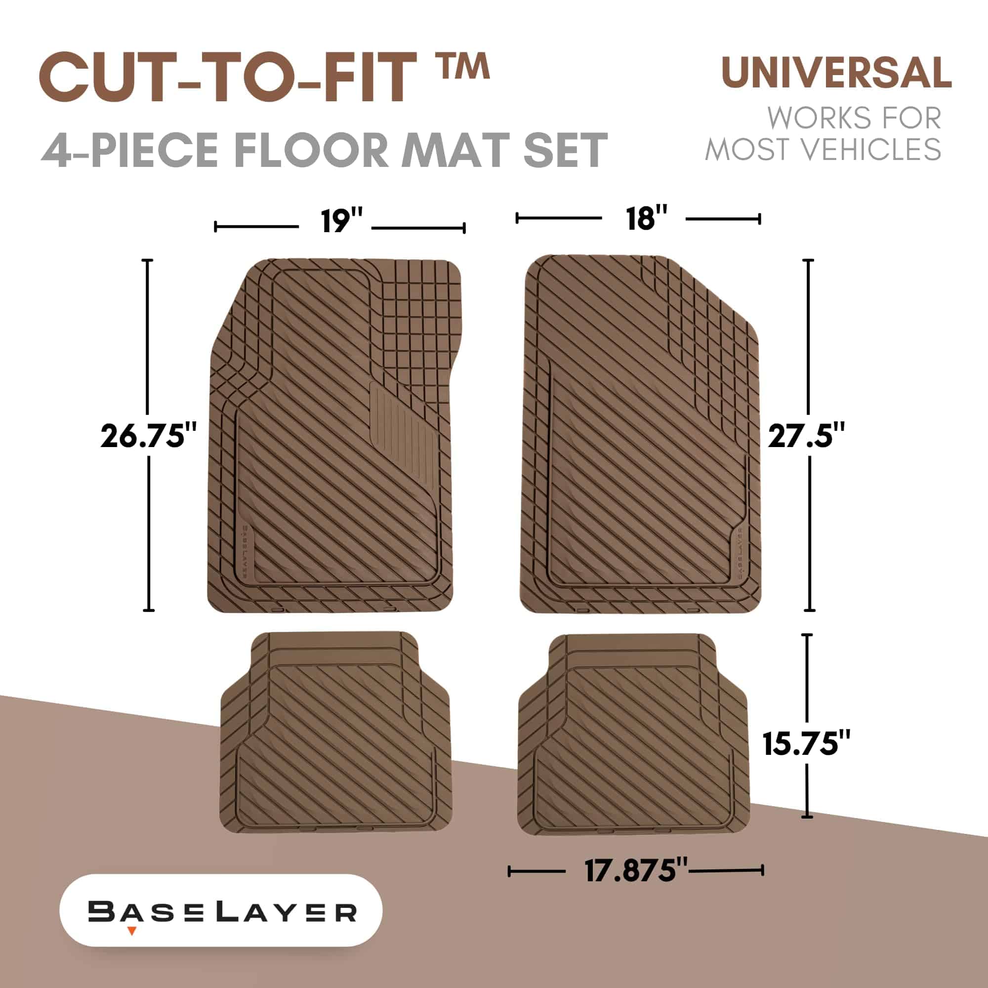 BASELAYER UNIVERSAL CUT-TO-FIT FLOOR MAT, COMPATIBLE WITH MOST VEHICLES – Easy to cut trim lines allow for a custom fit to your vehicle. Simply use scissors to trim the mats to the perfect fit. MADE IN THE USA – Every BaseLayer product is proudly designed and manufactured in the United States. We pride ourselves on designing and delivering all-American products to serve those seeking the utmost quality. EASY TO REMOVE AND CLEAN – Easy removability of all 4 mats to shake off dirt and debris without spilling inside your vehicle. Cleaning with soap and water returns your floor mats to almost like-new condition. NO SLIPS, NO ADHESIVES – We created a car floor mat that doesn�t require adhesives, keeping the surface smooth yet stable. Safety is our top priority, therefore each car floor mat is engineered with retention features on the bottom of mats for added stability, while the stylized, textured surface offers a non-skid top surface for added traction. PROTECTS FROM SNOW, RAIN, MUD, SPILLS – The ultimate clean car is now within your reach. A no-ridge design specifically engineered for quick and easy cleanup. These Chocolate Brown rubber-like floor mats won�t accumulate stains, dirt, spills, snow, liquids, sand, and any other messy debris or residue. DURABLE MATERIAL INTERIOR CAR MATS – Proprietary, rubber-like material provides good traction, stability (will not warp), and weatherability while localized, thickened cross-section in high wear zones increases durability. Includes 2 front floor mats and 2 rear mats. BaseLayer is the brand to trust: 100% heavy duty, 100% recyclable, including a Lifetime Limited warranty. SUPERIOR INJECTION-MOLDED MATERIAL – BaseLayer automotive floor mats are injection-molded from the best automotive-grade eco-friendly Thermoplastic Elastomers (TPEs) and are 100% recyclable. Our injection-molding process produces floor mats that far surpass our competition in consistent quality. Enhance your vehicle with our Chocolate Brown four-piece mat set, allowing you to showcase your favorite color, represent your team, or express your unique personality. These mats not only add a touch of style but also provide practical protection for your vehicle’s interior. Elevate your driving experience with a personalized touch because your car should reflect your individuality. Upgrade now and ride in comfort and style with our exclusive Chocolate Brown mat set!