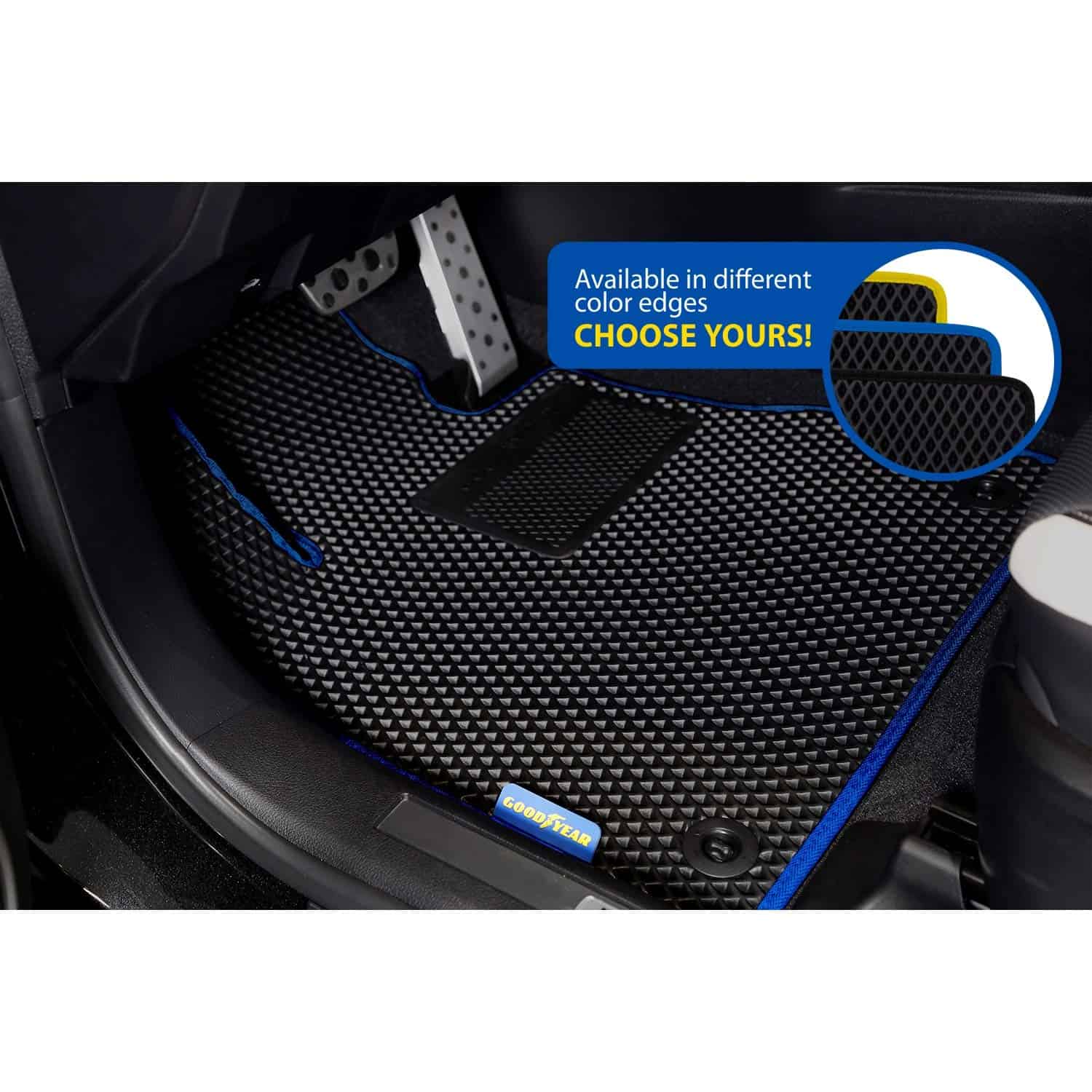 Juego de tapetes para autos Goodyear Precision-Fit (Juego de 4 piezas en Azul) Todo clima, resistentes al agua, con respaldo de malla antideslizante y sujetadores seguros. Tecnología en forma de diamante para la máxima contención de suciedad y líquidos. Fácil de limpiar – sacudir o enjuagar con manguera. Incluye forros delanteros y traseros. Accesorios de coche fuertes, confiables y permanentes. ¡Mejora tu experiencia de conducción y mantén tu coche más limpio con estos tapetes premium para SUVs, camionetas y autos. Haz clic en Agregar al carrito y actualiza tu vehículo con accesorios de coche de alta calidad!