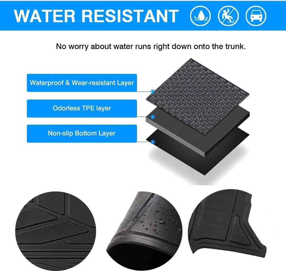 3. Material de alta calidad – Hecho de TPE, estos tapetes para todas las estaciones duran más que otras variedades. Resistente pero flexible, puede sobrevivir al estrés del barro, la nieve, la lluvia o el sol. Nuestros tapetes no tienen olor. No es necesario conducir con las ventanas abiertas.