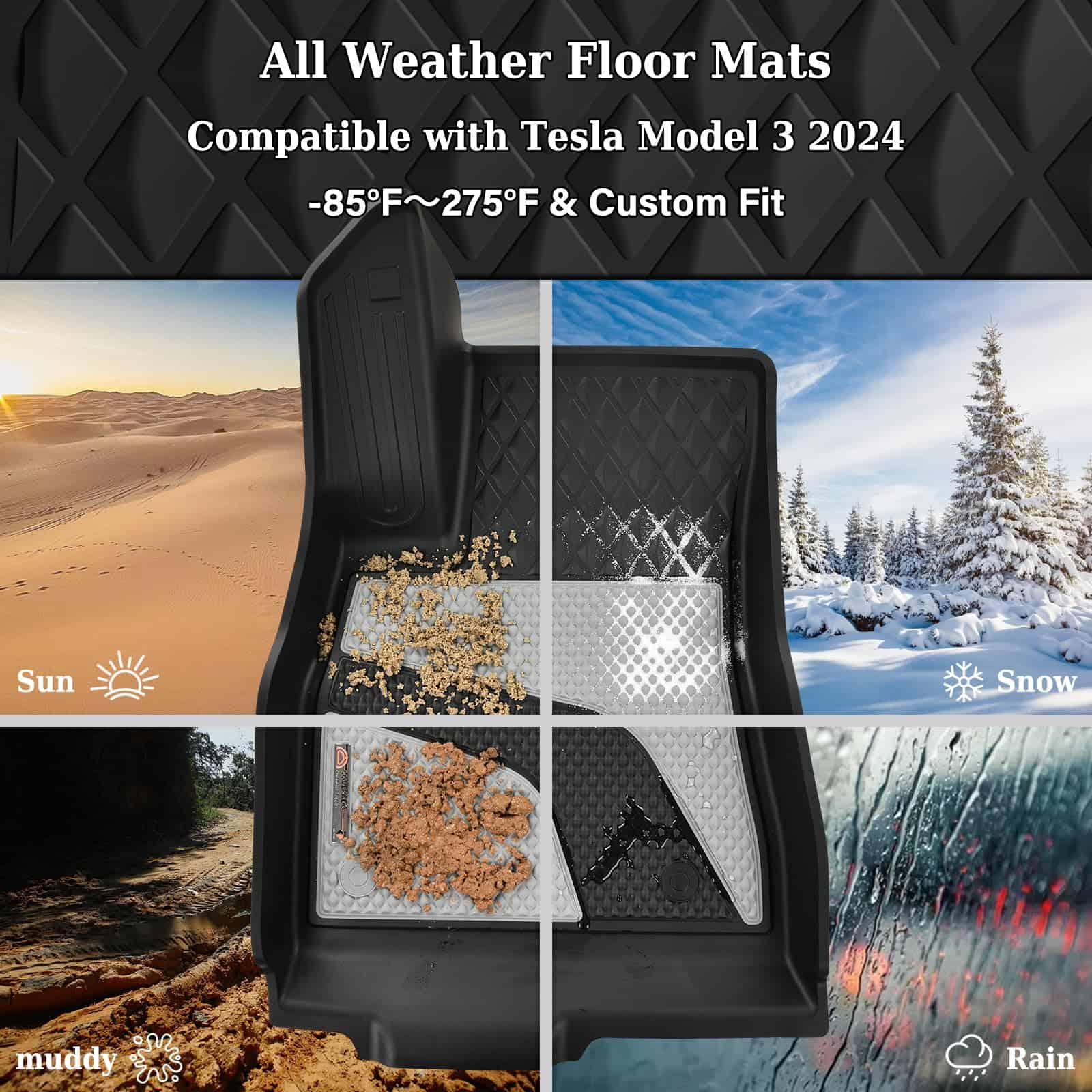 1. Ajuste personalizado – Los tapetes para piso están diseñados exclusivamente para Tesla Model 3 2024, encajan perfectamente en todas las áreas del piso y ofrecen máxima protección, diseño único de dos tonos que realza la apariencia general del interior del vehículo. Tapetes para el asiento trasero se pueden poner y quitar.