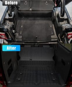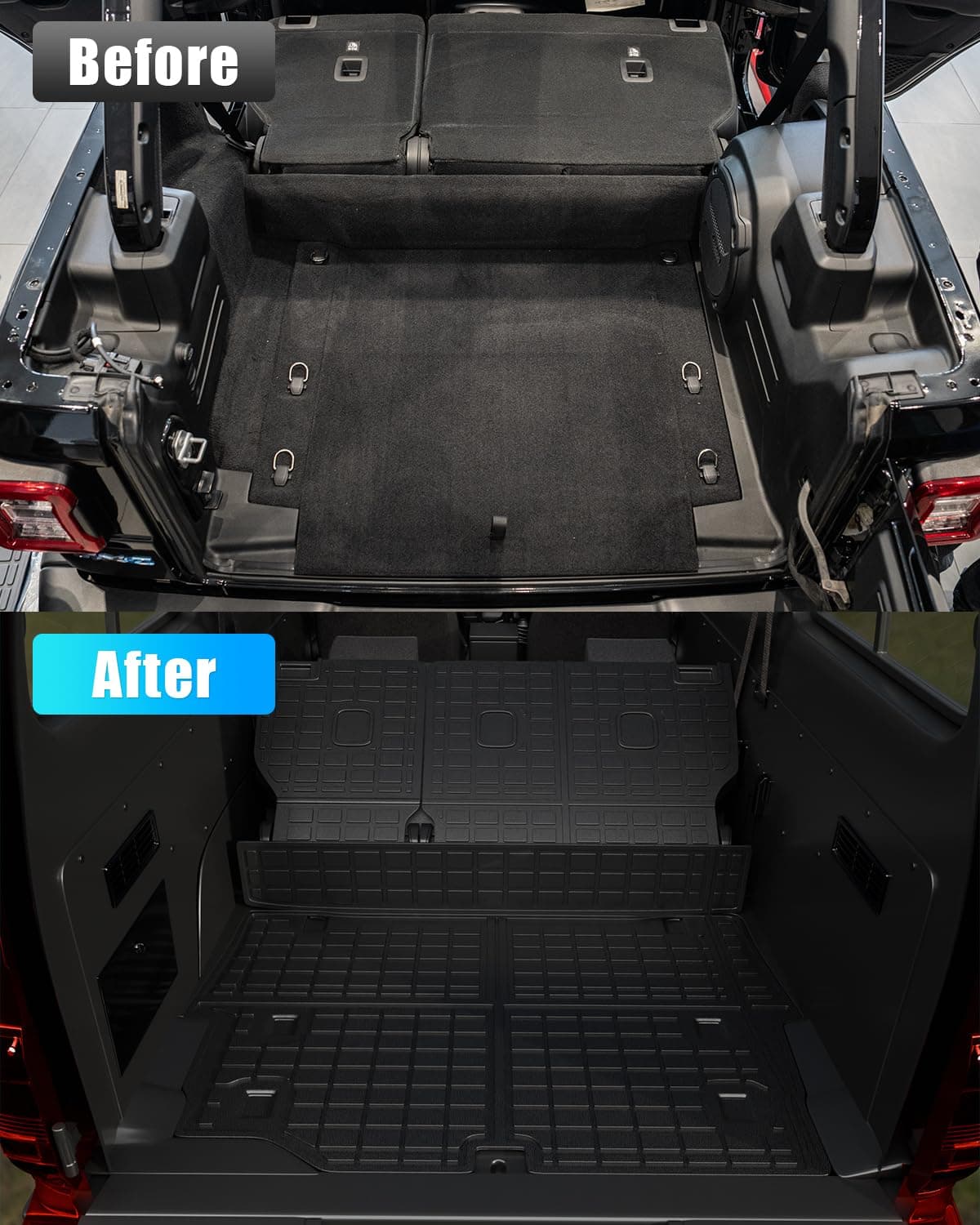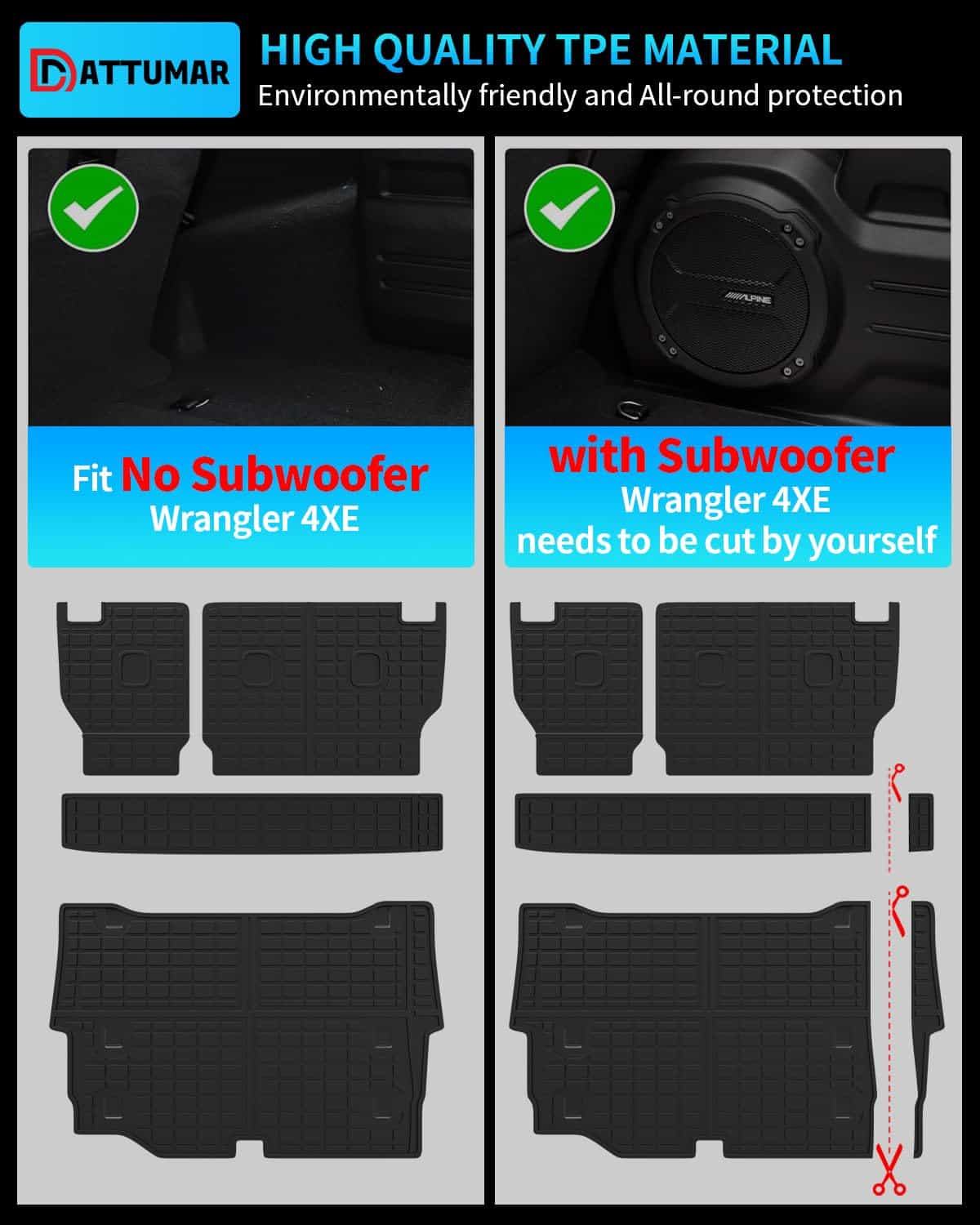 1. Diseño: De acuerdo con el diseño original del automóvil, nuestra alfombra de maletero, tapetes para respaldo y tapetes para piso son adecuados para Jeep Wrangler JL 4xe 2021 2022 2023 2024 2025, 7 piezas en total. Nota: no compatible con JL 4×4, y la alfombra del maletero debe ser cortada por ti mismo si el maletero de tu automóvil viene con un subwoofer! .