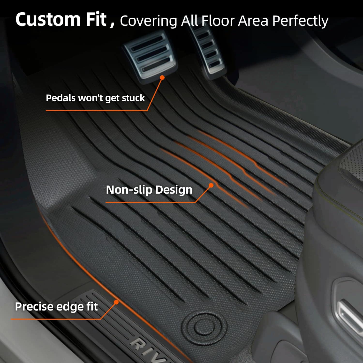 2. SEGURO Y DURADERO – Los forros para piso de Rivian R1T están hechos de material TPE de alta densidad, fácil de restaurar y mantener. No solo son seguros y extremadamente resistentes al desgaste, sino que también permanecen flexibles en condiciones de frío extremo. (Consejo: si tienen pliegues, déjelos en su entrada por una hora aproximadamente en el sol caliente y las marcas de los pliegues desaparecerán).