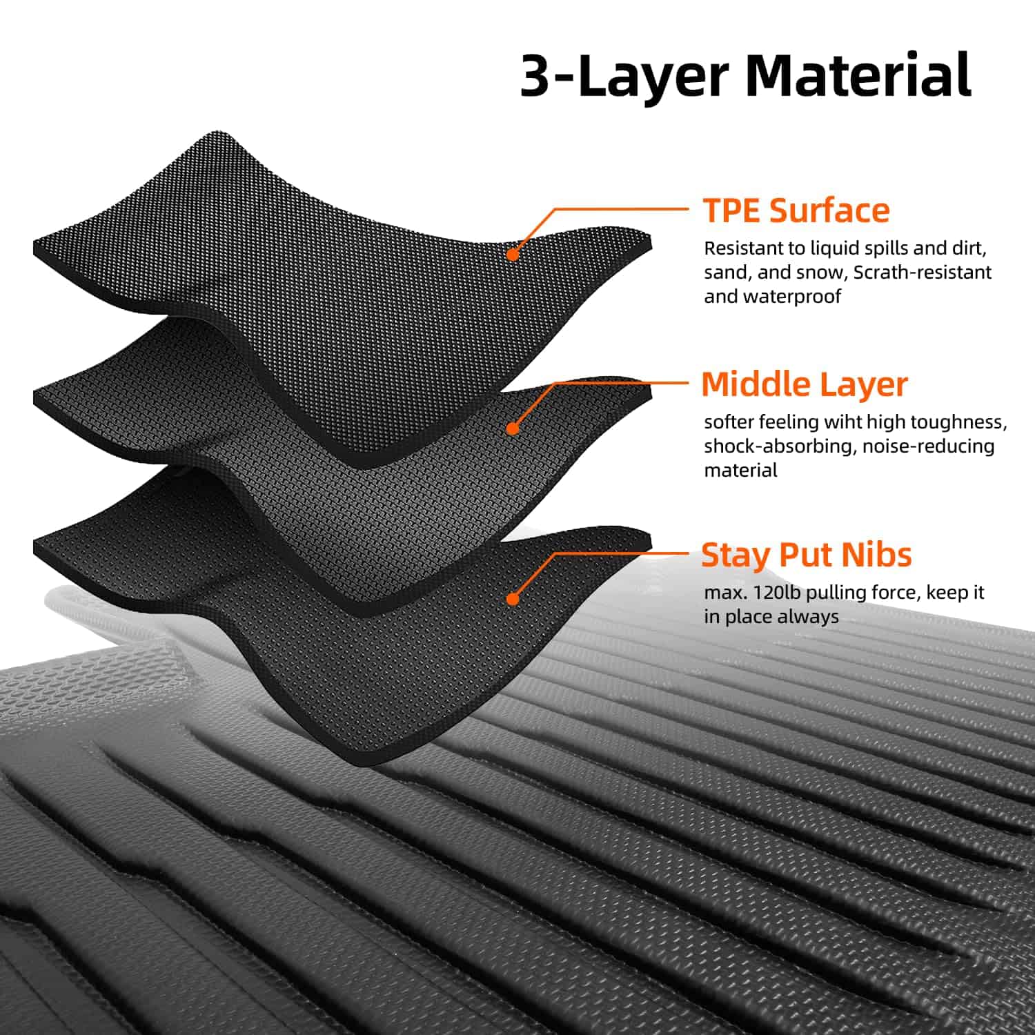 4. PROTECCIÓN PARA TODO TIEMPO – Los forros TPE para piso pueden evitar que la lluvia, la nieve, los líquidos, el barro y otros desordenes se filtren en la alfombra. Al limpiar, simplemente limpie con una toalla o retire el tapete para piso y enjuáguelo para quitar la suciedad, luego se verán y se sentirán como nuevos.
