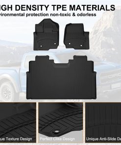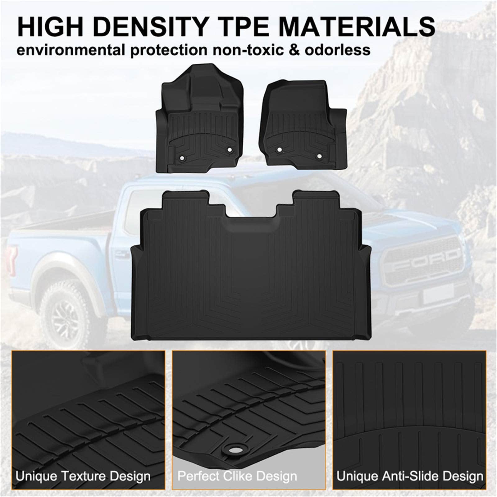 Los tapetes para piso KIWI MASTER Ford F150 SuperCrew Cab protegen los pisos del conductor y del pasajero del vehículo. Hechos de material TPE, estos tapetes resistirán los elementos duros, evitando manchas y humedad en las alfombras originales de fábrica. Limpie fácilmente los tapetes con jabón y agua caliente o fría y un cepillo suave, no se necesita un fregado brusco o limpiadores especiales. El respaldo de goma especial antideslizante evitará cualquier deslizamiento o movimiento al contacto. Mantenga su enfoque en su conducción, y no en ajustar sus tapetes de auto, mantenga el piso de su auto en condiciones prístinas, fácilmente, desde la marca confiable en accesorios para autos. br br br Especificación: br Color: Negro br Material: TPE br Peso de envío: 19.6 LBS br Dimensión del embalaje: 40.9 x 31.5 x 3.5 pulgadas br br br Compatible con: br Compatible con Ford F150 SuperCrew Cab 2015 2016 2017 2018 2019 (4 puertas de tamaño completo) con asientos de cubo en la 1ra fila. No es compatible con vehículos con pisos de vinilo. br br br Paquete incluido: br 1 Set de Tapetes para piso para Ford F150 SuperCrew Cab