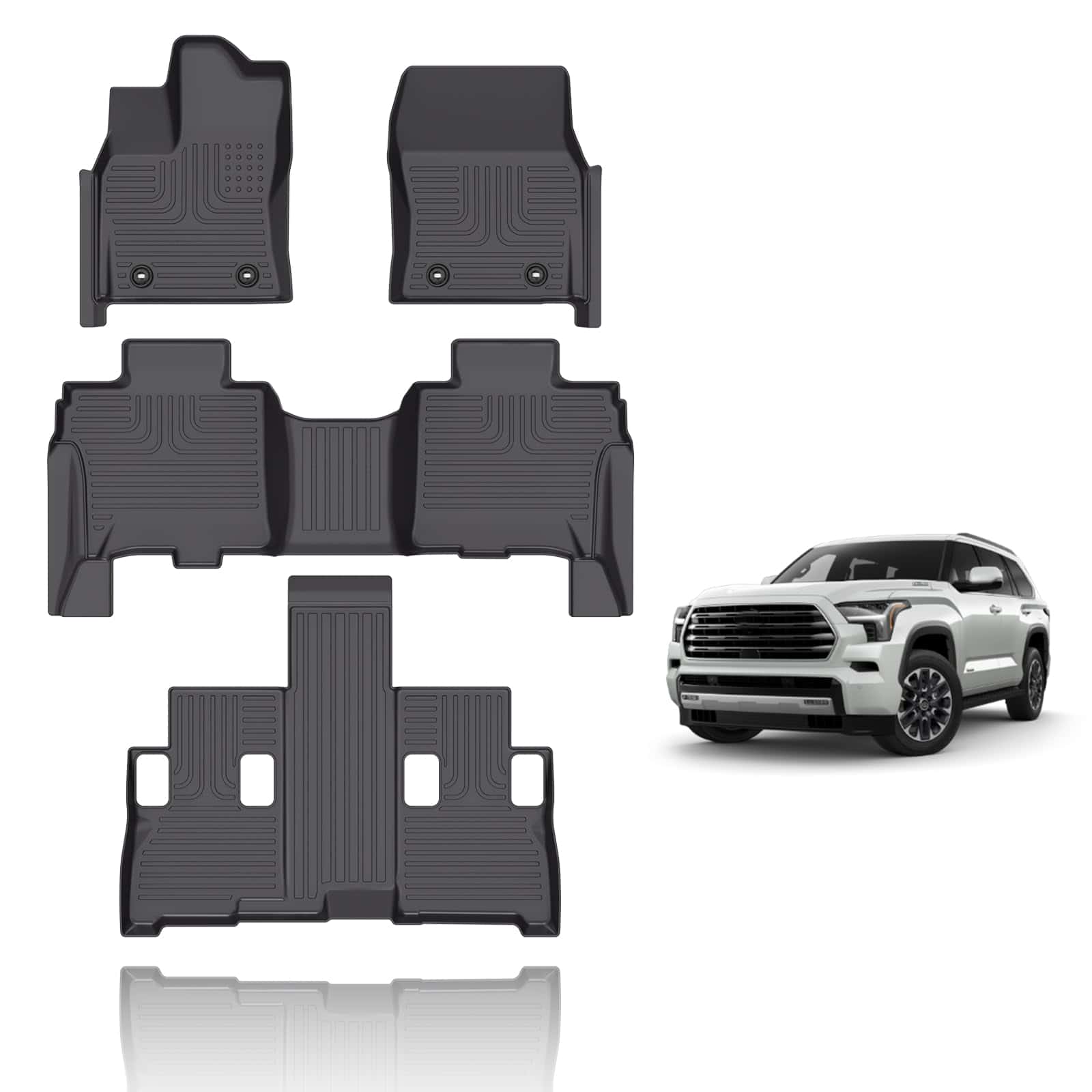 2. Seguro y Duradero: Los tapetes para Toyota Sequoia 2023-2025 están hechos de material TPE. El material TPE de alta calidad no solo proporciona un excelente tacto y resistencia extrema a la abrasión, sino que también permanece flexible incluso en climas calientes y fríos, garantizando la seguridad.