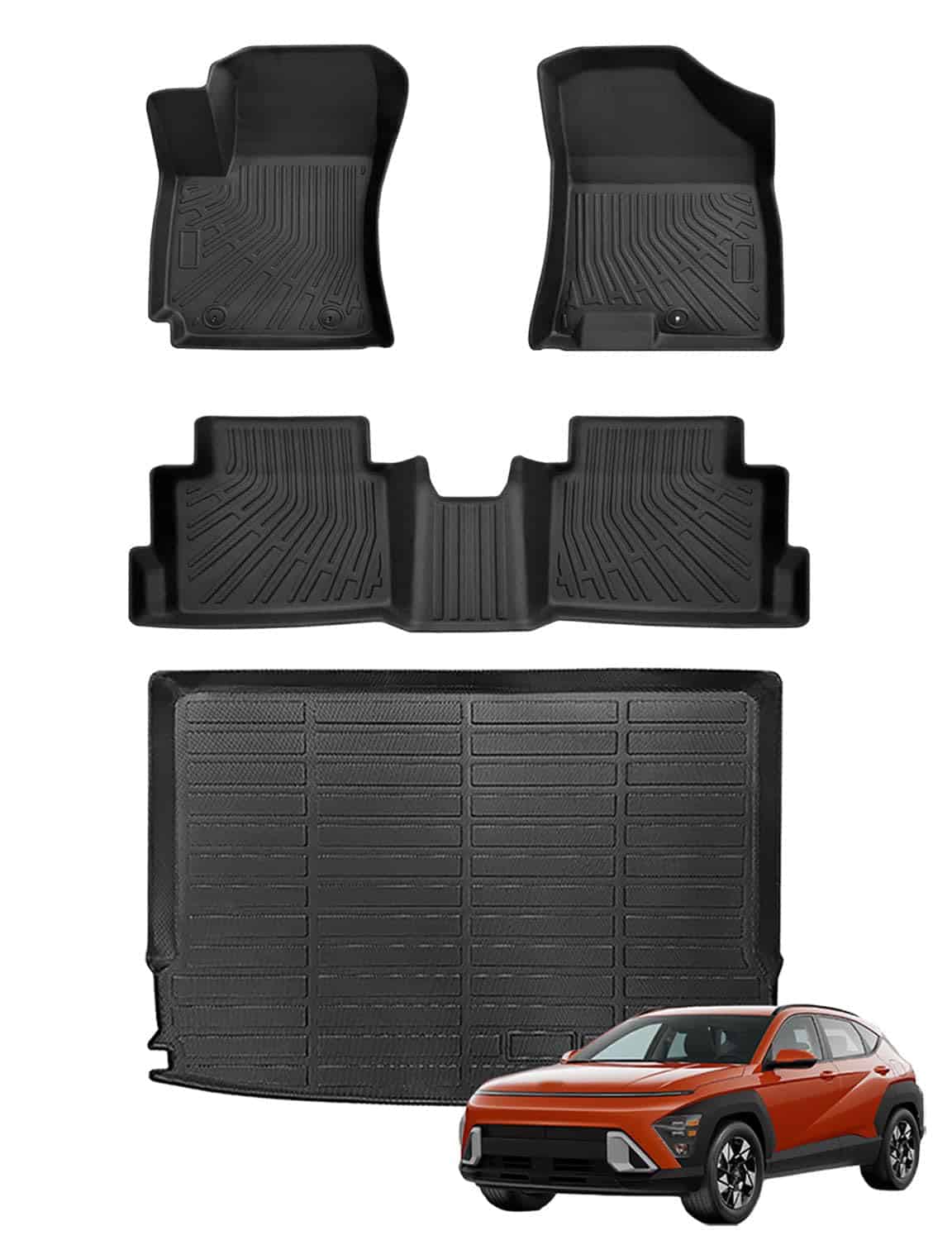 Juego de tapetes para piso y forro de maletero compatibles con Hyundai Kona 2024 SE | SEL | N LINE | Limited (No Modelos Eléctricos). Estos protectores de piso y forro de maletero impermeables ofrecen una protección total para todo clima. Diseñados a medida para el Hyundai Kona 2024, estos tapetes para piso y forro de maletero son muy fáciles de instalar sin necesidad de cortar ni construir. La superficie lisa de los tapetes evita la adherencia de suciedad y cuenta con un diseño de canal de agua alto y bajo que los hace impermeables y fáciles de limpiar. La durabilidad y resistencia al deslizamiento de los tapetes garantizan la seguridad al conducir. Utilizables en todas las condiciones climáticas, los tapetes evitan derrames de líquidos y residuos. Nuestro equipo de soporte al cliente está disponible para atender cualquier pregunta o inquietud que pueda surgir.