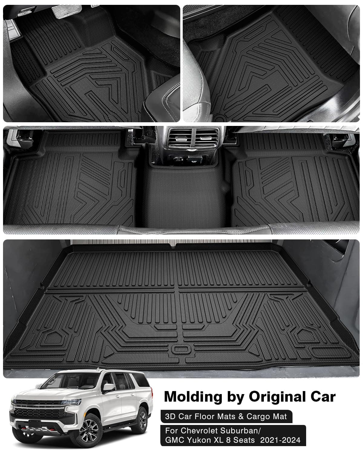 1. Ajuste Personalizado: Estos tapetes de piso y forro de maletero están especialmente diseñados para Chevrolet Suburban/GMC Yukon XL de 8 Asientos 2021-2025. Los revestimientos de piso y forro de maletero están hechos con escaneo láser digital de precisión en 3D para proteger el espacio de tus pies dentro del automóvil. Diseño 3D antideslizante, estilo moderno y duradero.