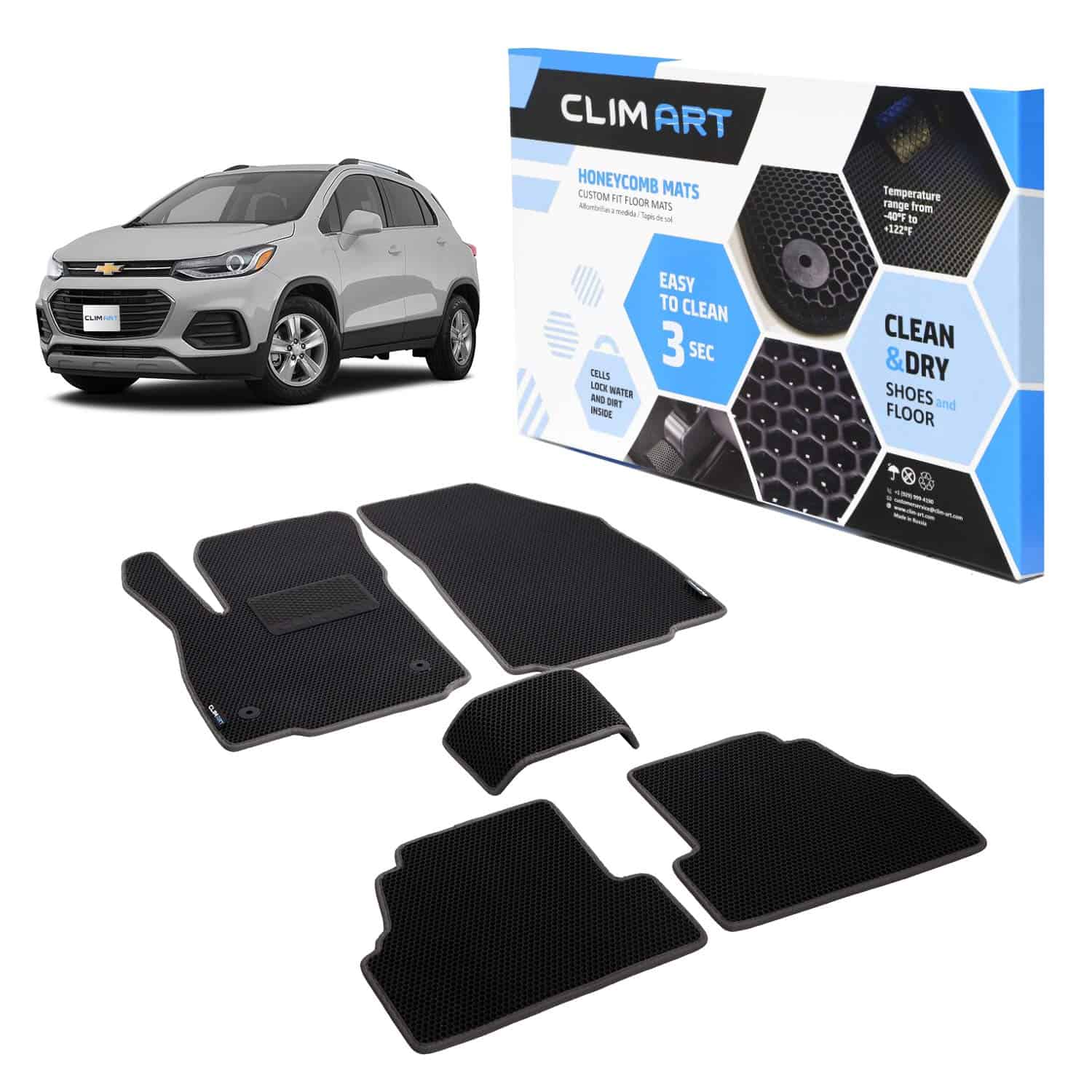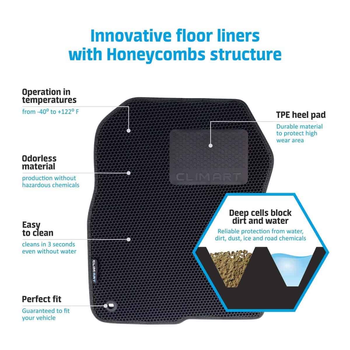 Estás constantemente subiendo y bajando de tu vehículo, ya sea en viajes de compras, llevando a los niños al parque, yendo a trabajar o tratando de hacer una parada extra en el gimnasio. Eso significa que tus zapatos siempre están trayendo suciedad, barro y humedad que pueden dañar y manchar los pisos bastante rápido. Por eso desarrollamos estos tapetes personalizados Clim Art Honeycomb que ofrecen una cobertura óptima de piso para tu vehículo mientras ayudan a reducir el desorden traído por conductores y pasajeros.