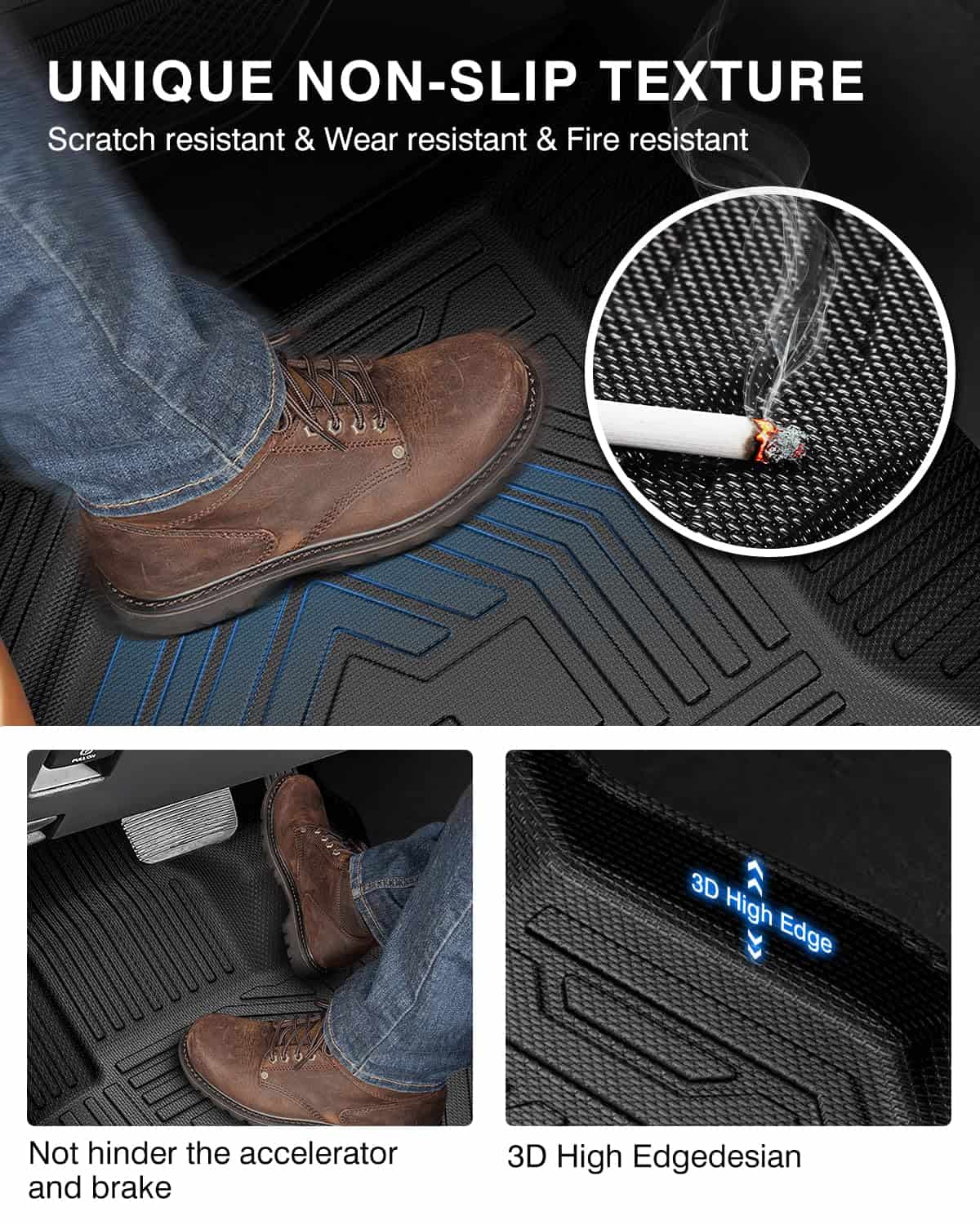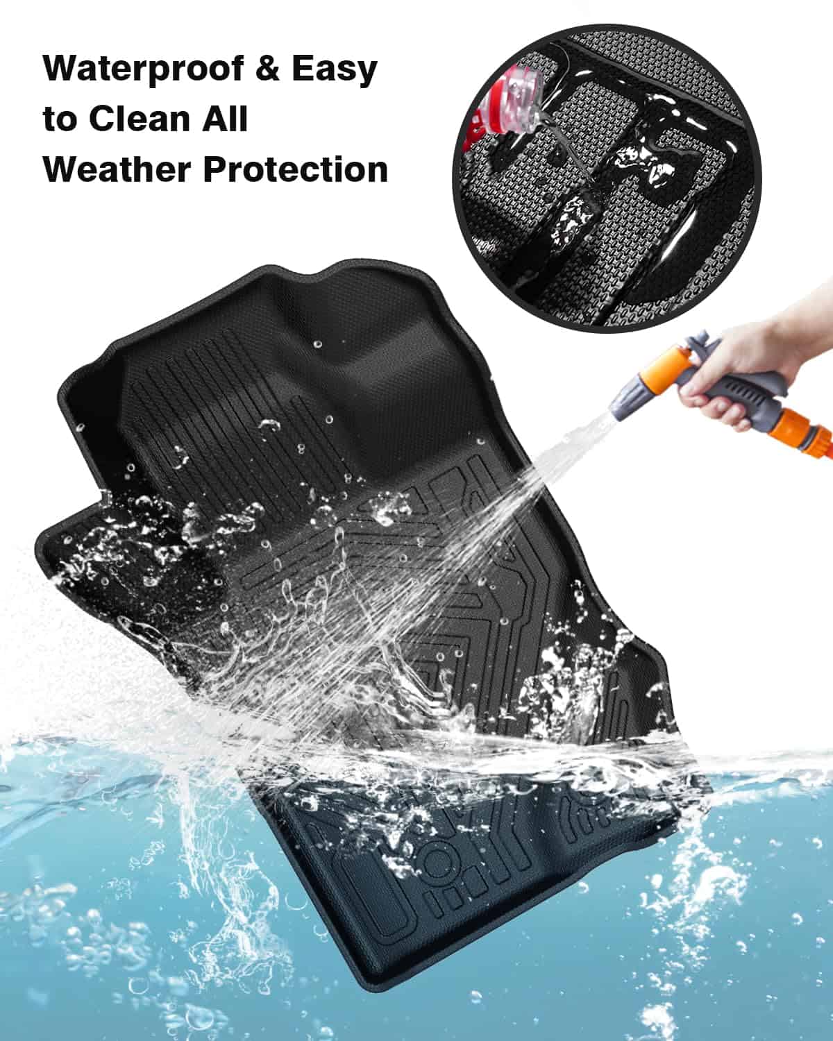 3. Tapete para Todo Clima y Forro de Carga: Estos tapetes para pisos y forro de carga ofrecen protección contra variables externas (como barro, líquidos y nieve) y prolongarán la vida del interior del automóvil en cualquier clima (lluvia, niebla, nieve, etc.). Los tapetes para pisos y el forro de carga son fáciles de limpiar simplemente pasando un paño, enjuagando o usando agua y jabón.