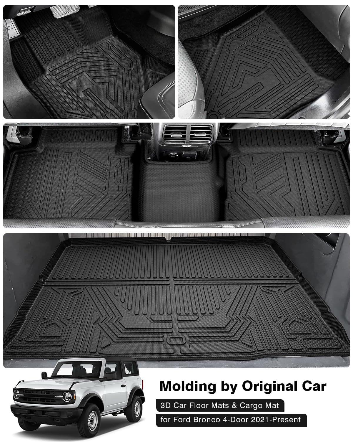 5. Fácil Instalación: Fácil de instalar o quitar. Es literalmente tan simple. ¡Por favor, brinde protección a su automóvil. Si tiene alguna pregunta sobre el forro de carga y los tapetes para pisos de su Ford Bronco 4 Puertas 2024 2023 2022 2021, contáctenos inmediatamente y le brindaremos un servicio postventa satisfactorio.
