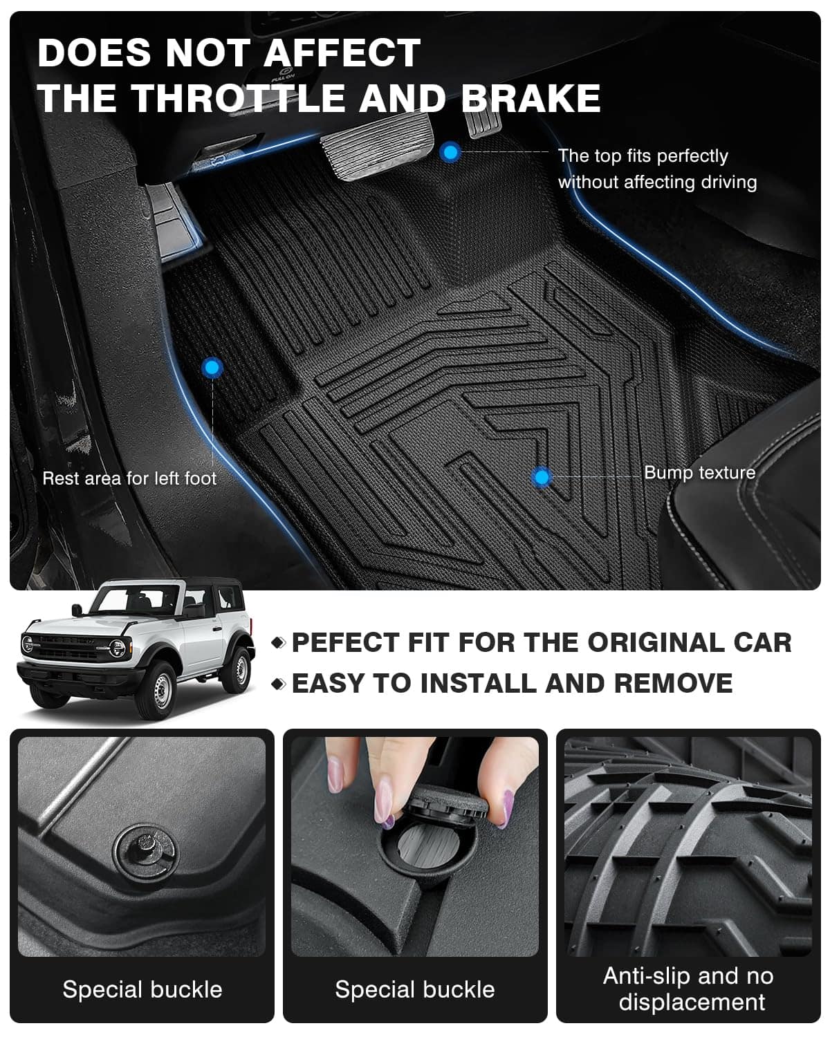 4. Tapetes para Pisos y Forro de Carga en 3D: Diseño con bordes elevados para una efectiva resistencia al polvo y agua, sin filtraciones y desmontable. Los tapetes para pisos del Ford Bronco 4 Puertas 2021 2022 2023 2024 vienen con hebillas de automóvil originales, son estables sin desplazamiento, no afectan el uso del acelerador y el freno, haciendo la conducción más segura.