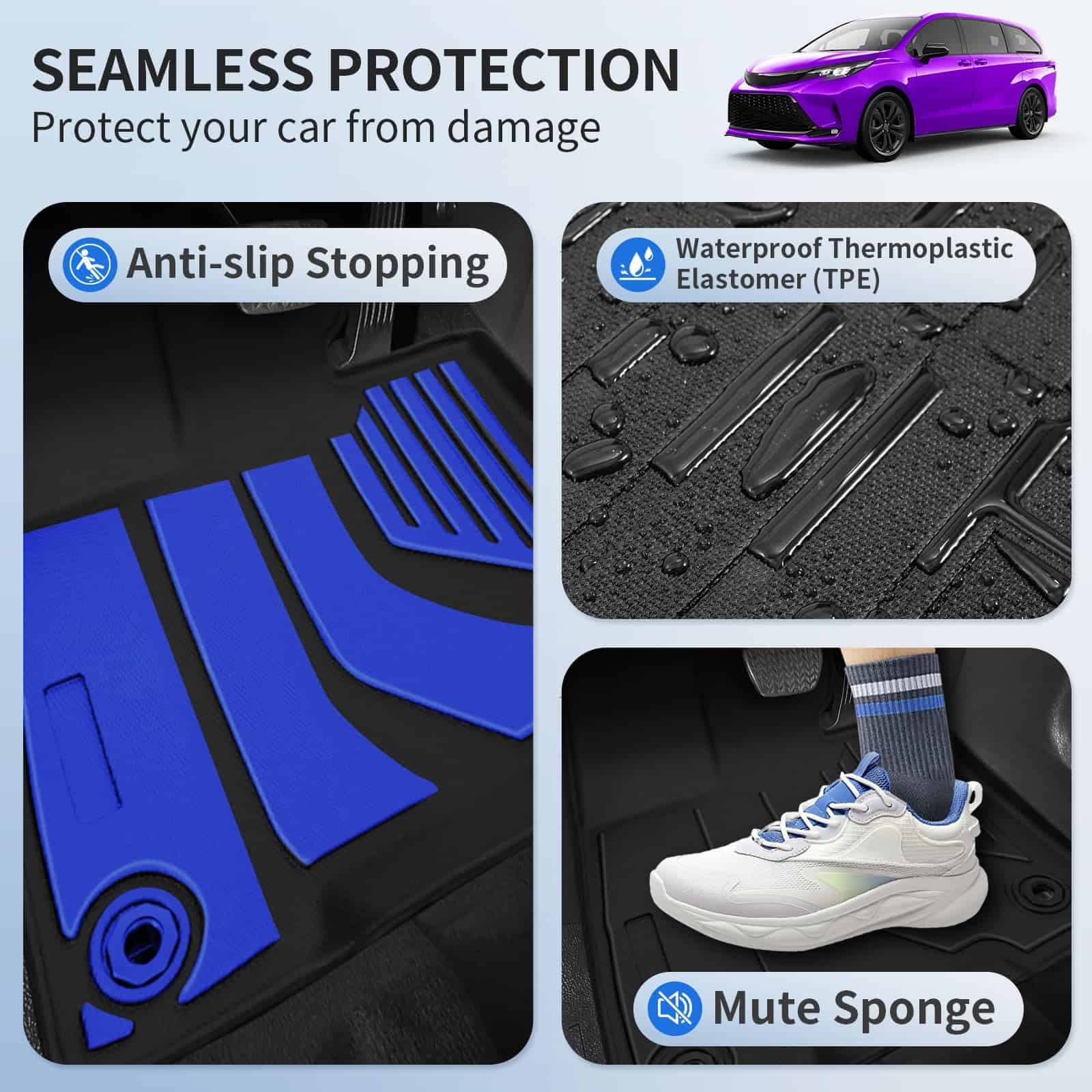 Tapetes para suelo de Toyota Sienna 8 asientos 2025-2021 (No apto para la edición Platinum 2025) Juego completo de tapetes para todas las estaciones para accesorios de Toyota Sienna 2025-2021 Tapete de maletero TPE con tapete de respaldo. Los tapetes para todas las estaciones Sienna de TSLDRV están diseñados para proporcionar una protección integral para su Sienna contra suciedad, barro, sal, lluvia y nieve. Las elevaciones altas de los tapetes de goma TPE bloquean eficazmente líquidos, nieve y arena en la almohadilla interior original, manteniéndola limpia y seca en todas las estaciones. Los tapetes para el suelo de Sienna para todas las estaciones se ajustan a Toyota Sienna de 8 asientos LE, XLE, Woodland Edition, Platinum Edition, Limited 2025 2024 2023 2022 2021. Nota: NO APTO PARA la edición Platinum 2025 O DE 7 ASIENTOS, que incluye 1 tapete para el lado del conductor, 1 tapete para el lado del pasajero delantero, 1 tapete para el lado del pasajero de la segunda fila/tercera fila y tapete de maletero con tapete de respaldo. Los tapetes para el lado del conductor con una almohadilla para el talón con textura antideslizante fomentan una conducción segura con mayor control del pie. Los tapetes para el suelo TSLDRV para Toyota Sienna de 8 asientos 2025-2021 están hechos de tres capas. La primera capa está hecha de material TPE que es resistente al agua. La capa interna adopta una esponja muda que absorbe el ruido interior que brinda más comodidad. Y la parte inferior antideslizante puede mantenerlo en su lugar y no se moverá. El tapete para maletero TSLDRV para Toyota Sienna es fácil de limpiar. Solo necesita quitarlos de su Sienna y sacudirlos o rociarlos con una manguera, esperar a que se sequen. El tapete de carga pesada TSLDRV con tapete de respaldo para Toyota Sienna está hecho de TPE sin toxinas y sin olor, asegura 100% de seguridad, incluso en el cálido verano, los tapetes para el suelo no huelen. TSLDRV es una tienda profesional de accesorios para automóviles que todos los productos disfrutan de un servicio posventa de 2 años. Nuestro equipo de servicio siempre está a su disposición para ayudarlo a resolver cualquier problema.