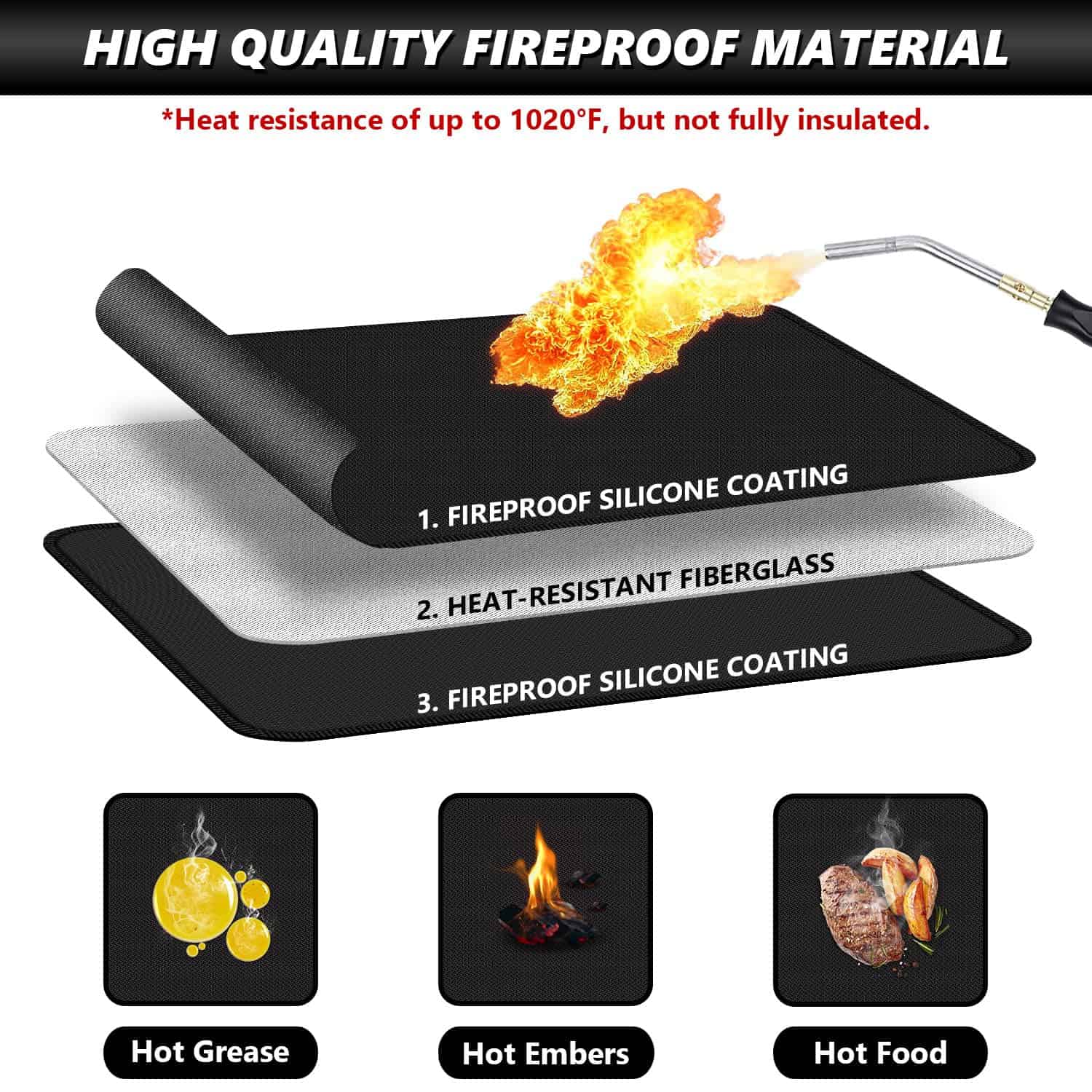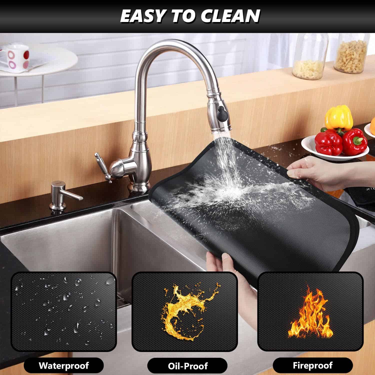 1. ¡Protege tu encimera! Nuestro tapete resistente al calor está hecho de fibra de vidrio ignífuga de doble cara con recubrimiento de silicona. Puede evitar que el aceite, manchas de café y salsas dañen la encimera. ¡Mantén un área de cocina limpia y ordenada sin esfuerzo!