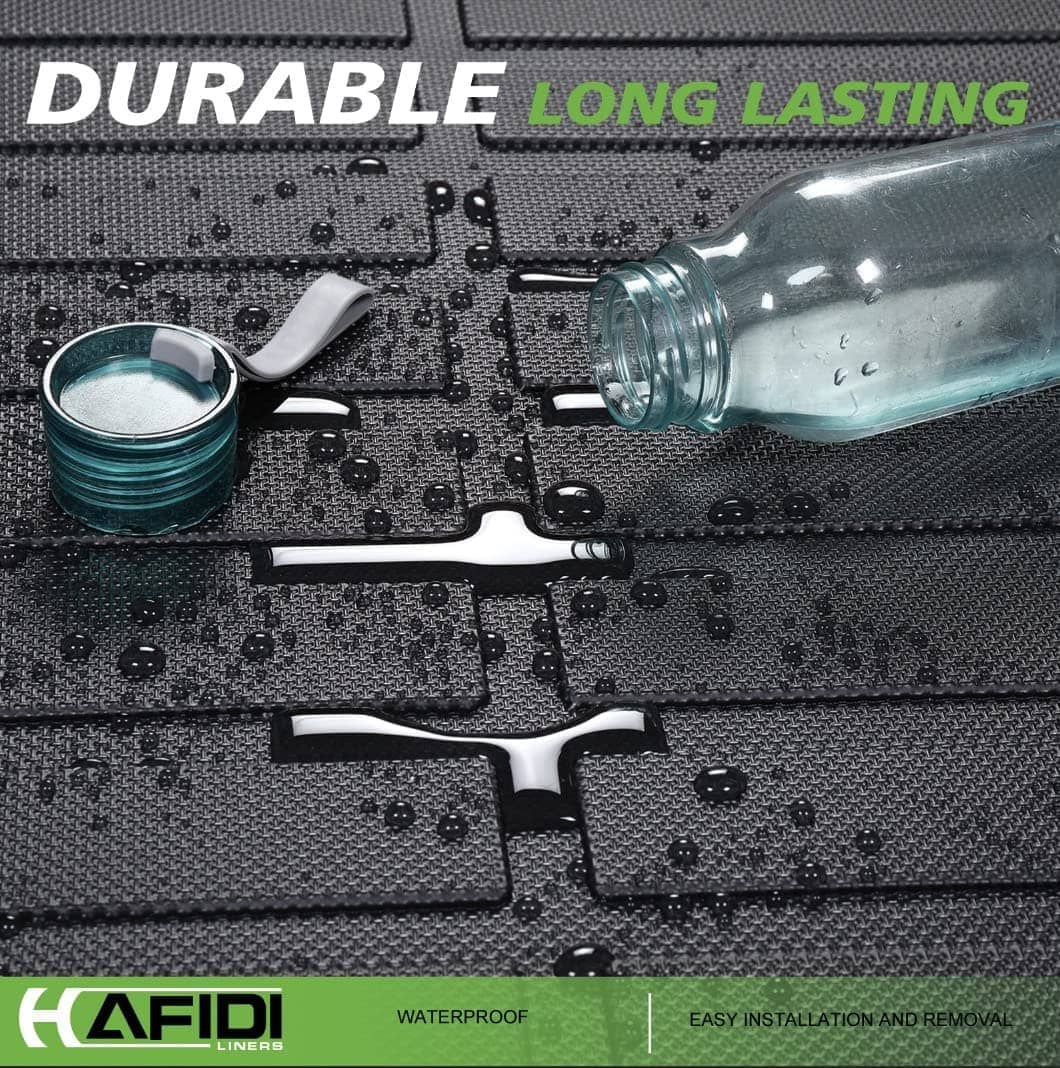 3. PROTECCIÓN PARA TODAS LAS CONDICIONES METEOROLÓGICAS Tapetes a prueba de agua HAFIDI. Canales ergonómicamente diseñados y bordes elevados atrapan eficazmente líquidos, arena, nieve, etc. y protegen bien el piso del vehículo. El diseño de hebilla antideslizante se ajusta a la posición original del automóvil para garantizar que el tapete de piso esté firmemente fijado en su lugar.