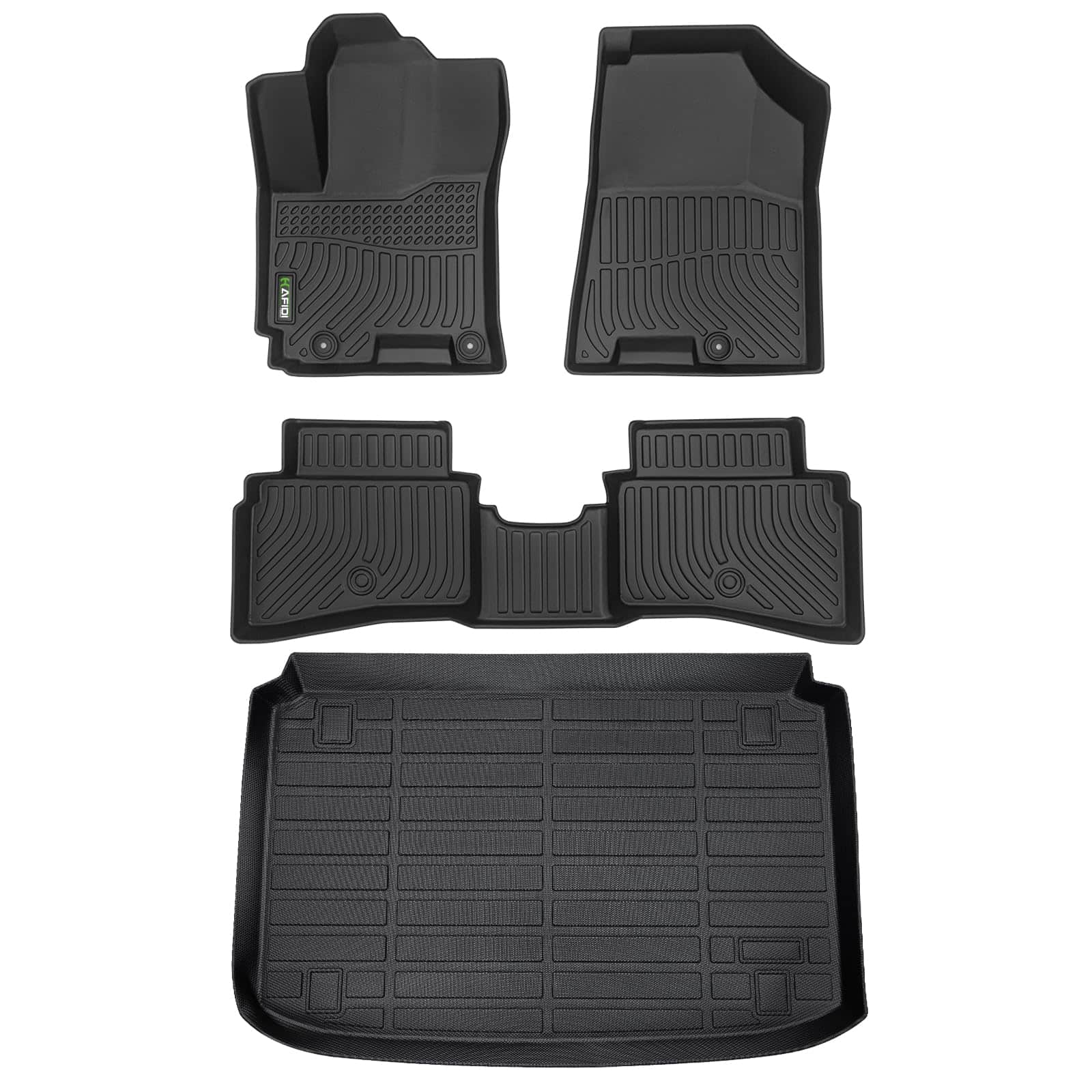 Tapetes y protector de maletero personalizados HAFIDI para Hyundai Venue 2020-2024. Este conjunto proporciona protección total para el coche y cuenta con tapetes para las filas delanteras y traseras, así como un protector de maletero. Fabricados con material TPE de alta calidad, estos tapetes garantizan durabilidad y resistencia a la deformación en cualquier clima. Los canales ergonómicos y los bordes elevados ayudan a mantener limpio el suelo del vehículo al atrapar líquidos y suciedad. Fáciles de limpiar, estos tapetes pueden limpiarse con un paño húmedo o lavarse con agua. Con la garantía de satisfacción del cliente, los tapetes HAFIDI para Hyundai Venue son la elección perfecta para proteger el interior de su coche.