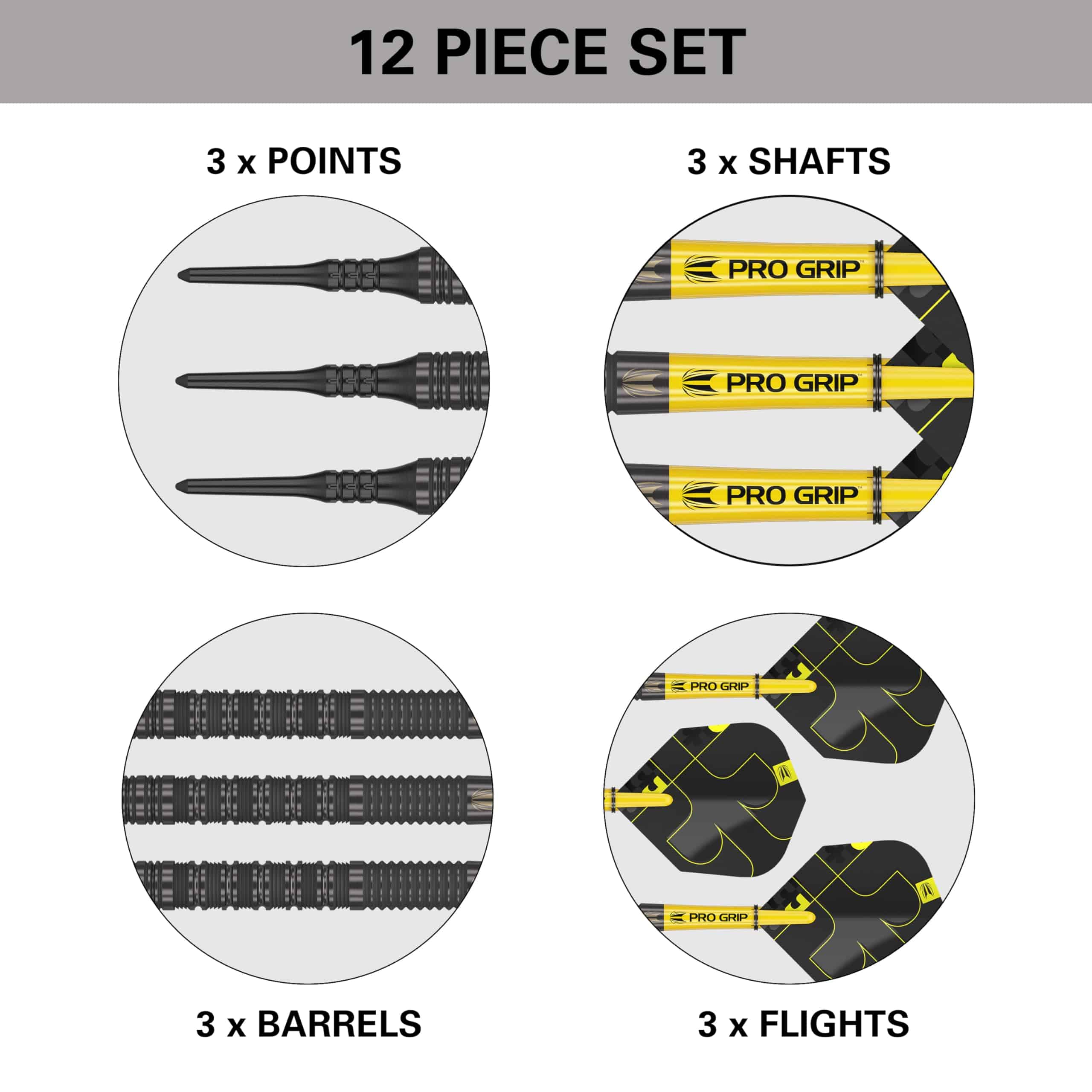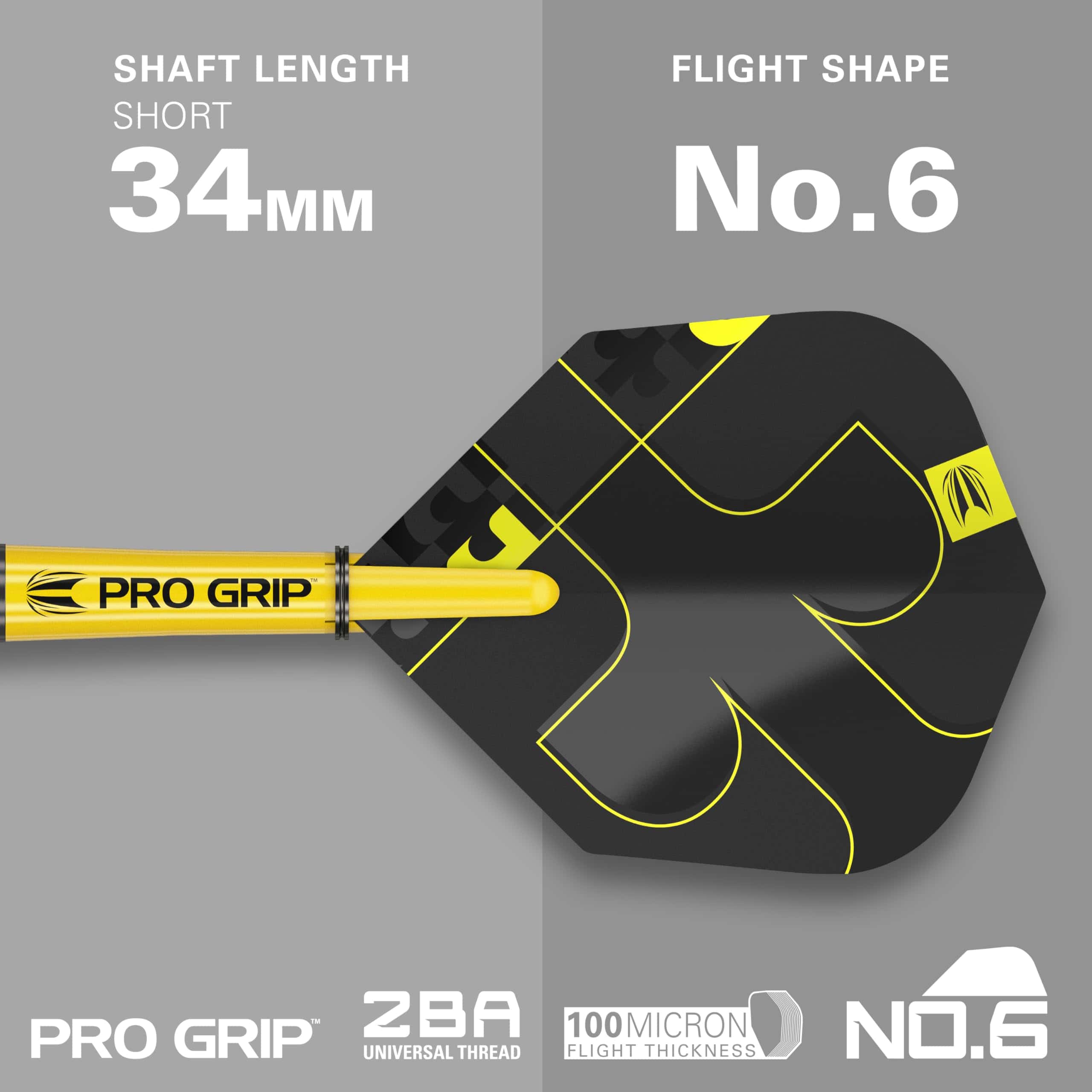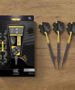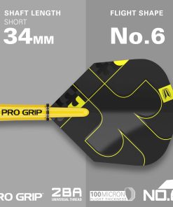 4. Ejes Pro Grip y Vuelos Pro.Ultra – Los dardos se completan con ejes cortos amarillos Pro Grip y vuelos Pro.Ultra No.6 de 100 micrones que encajan de forma segura, con un diseño especialmente elaborado. Todos los ejes de Target Darts tienen la rosca 2BA universal, garantizando la máxima compatibilidad con barriles de prácticamente cualquier marca.