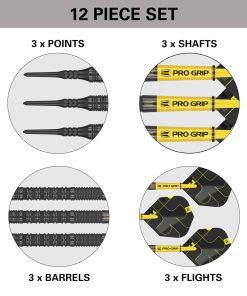 5. El pack contiene: 3 x Barriles de Tungsteno del 90%, 3 x Puntas de Punta Pixel Negras, 3 x Ejes Pro Grip, 3 x Vuelos Pro.Ultra No.6