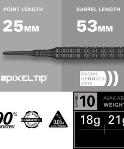 2. Barriles de 90% de Tungsteno. El Bolide Void presenta un barril de 90% de tungsteno de alta densidad, conocido por su excepcional relación peso-volumen, con un revestimiento de titanio negro chorreado que no solo mejora la estética del dardo, sino que también añade una capa adicional de durabilidad. El diseño del barril 10 está disponible en 18g (53mm de longitud, 6.2mm de diámetro) y 21g (53mm de longitud, 6.5mm de diámetro). La punta suave Pixel ha sido diseñada por Target para ofrecer un alto rendimiento con un rebote mínimo.