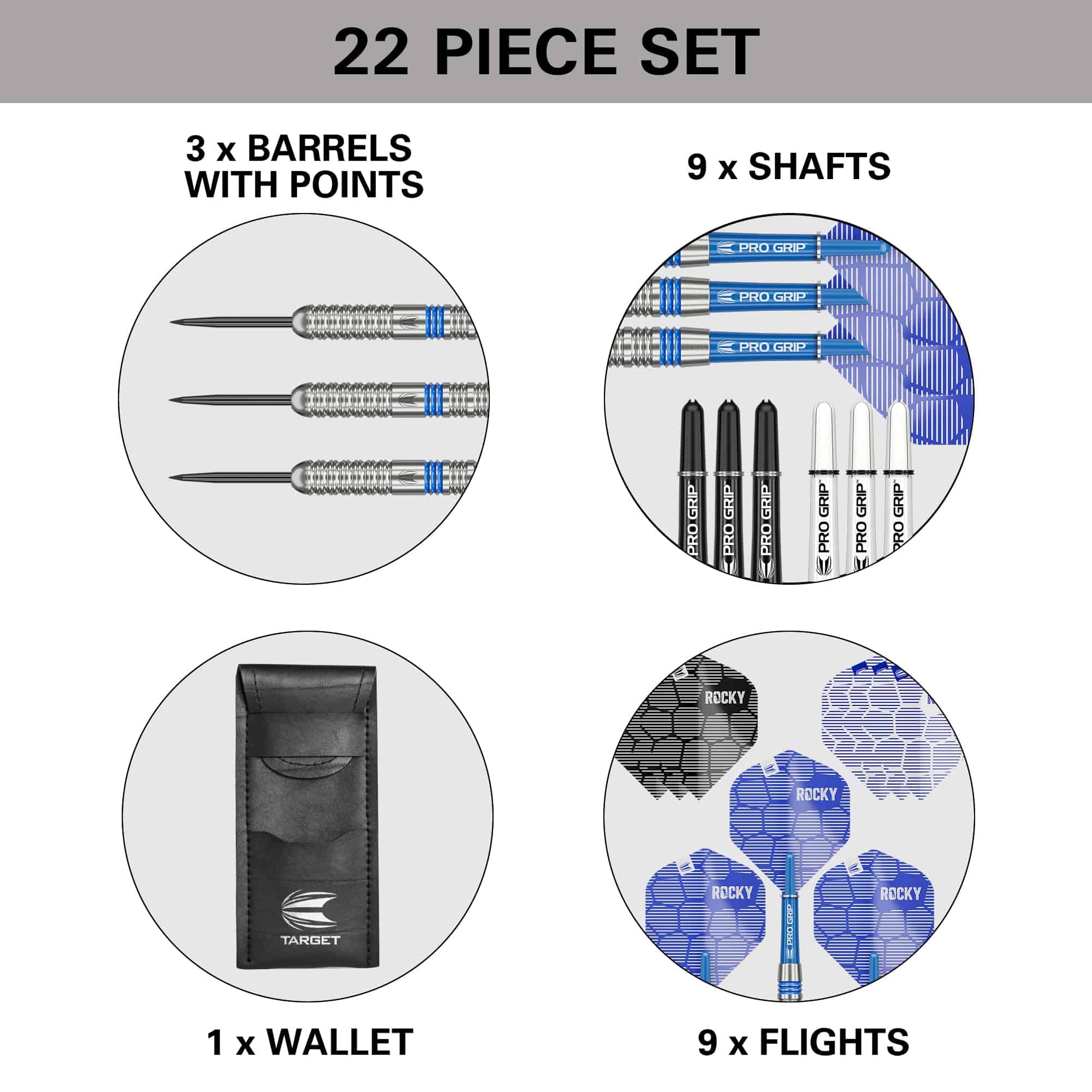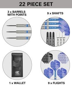 2. PRO GRIP SHAFTS & PRO ULTRA FLIGHTS: Incluidos en el set hay 3 sets de ejes de agarre profesional (cortos, 34mm) que te permiten personalizar tu configuración de dardos con 3 opciones de color diversas; negro, blanco y azul. Fabricados a partir de un compuesto de nylon duradero, y roscado universal 2BA. También se proporcionan los vuelos Pro Ultra No.2 en 3 combinaciones de colores, hechos de un material duradero de 100 micrones, con una impresión UV en relieve que agrega una capa adicional de recubrimiento al vuelo. 3. ESTUCHE DE DARDOS DE PERFIL DELGADO: Para mantener tu set de dardos en condiciones listas para jugar, este pack incluye un estuche de 3 dardos de tamaño de bolsillo con espacio adicional para guardar vuelos y ejes de repuesto, asegurando que siempre estés listo para dar el paso al oche. 4. SUSCRIPCIÓN A LA APP DARTCOUNTER: Obtén acceso de 1 mes a DartCounter, la aplicación líder mundial de puntuación de dardos y comunidad de jugadores. Registra tus puntajes, mira juegos en vivo y juega en línea con amigos desde cualquier lugar del mundo. Disfruta de funciones como juego en línea por cámara y una variedad de populares juegos de dardos. 5. EL PAQUETE CONTIENE: 3x Barriles de Dardos de Tungsteno al 80% con puntas de níquel negro fijas (26mm), 9x Ejes de Agarre Pro (Cortos, 34mm) en Blanco, Negro y Azul, 9x Vuelos Pro Ultra No.2 en Blanco, Negro y Azul, y 1x Estuche de Barras, y una Suscripción de 1 Mes a la App DartCounter.
