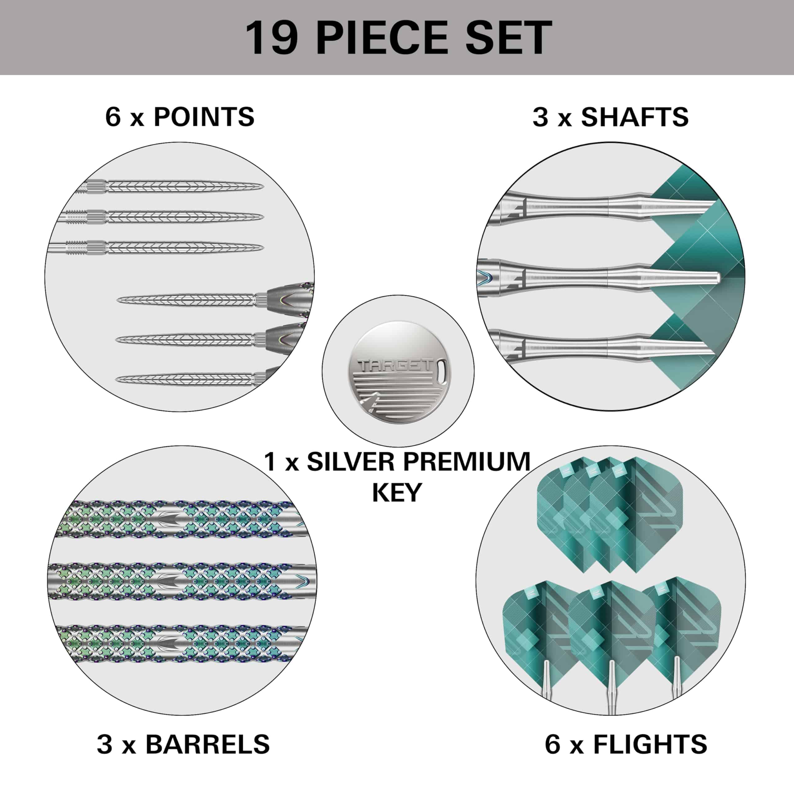 La gama de dardos Rove se inspira en interfaces digitales avanzadas y el mundo dinámico de la navegación moderna, los dardos Rove encarnan una sensación futurista. Reflejando el compromiso de Target con la innovación, el esquema de colores y los detalles de diseño de Rove hacen eco del aspecto elegante y sofisticado de los tableros de alta tecnología y pantallas digitales. Los barriles rectos Rove 01 de 90% de tungsteno cuentan con un fresado de precisión y están recubiertos con un llamativo acabado de carbono similar al diamante verde. La textura detallada y los elementos de diseño se integraron para ofrecer un agarre y control superiores. El barril recto ofrece un agarre consistente a lo largo de toda la longitud del barril, proporcionando una sensación equilibrada y adaptándose a varios estilos de agarre de los dedos. Las Puntas Suizas RVE de Target, diseñadas junto con los dardos Rove, con un diseño grabado con láser que ofrece un máximo agarre en el tablero. Las puntas suizas están diseñadas con un mecanismo de bloqueo patentado que permite cambiar las puntas de dardos sin esfuerzo. La tecnología de cono y rosca proporciona una posición segura y bloqueada, ofreciendo estabilidad y precisión en cada lanzamiento. Elija entre dos longitudes de punta: 26mm y 30mm; use la herramienta de llave suiza premium incluida para personalizar la configuración del dardo. Los dardos incorporan ejes de Titanio Pro (Cortos, 34mm), con un perfil delgado, los ejes son ligeros, pero fuertes debido a su material de titanio. El extremo de aluminio reemplazable permite una conexión más fuerte entre el vuelo y el eje. Incluidas en el set están las plumas Pro Ultra Rove Edition, en dos opciones de tamaño: No.2 y No.6, permitiendo a los jugadores personalizar su configuración basándose en su estilo de lanzamiento. El set de dardos se presenta en una elegante lata de almacenamiento de dardos Target Darts de color negro. Diseñada tanto para estilo como funcionalidad, la lata almacena de forma segura tus dardos y accesorios, manteniendo todo organizado y protegido en un solo lugar.