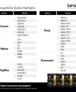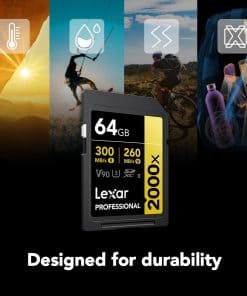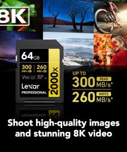 Las tarjetas Lexar Professional 2000x SDHC/SDXC UHS-II te permiten capturar y transferir rápidamente fotos de alta calidad y longitudes extendidas de video Full-HD y 4K de calidad cinematográfica, con una velocidad de transferencia de lectura de hasta 300MB/s (2000x). Las tarjetas también aprovechan la tecnología UHS-II (UHS Speed Class 3 (U3)) para un rendimiento de alta velocidad, lo que te permitirá avanzar rápidamente en la postproducción con una transferencia de archivos super rápida de la tarjeta a la computadora. Esto acelera drásticamente el flujo de trabajo desde el principio hasta el final, para que puedas ahorrar tiempo y volver al negocio de la fotografía. Estas tarjetas también vienen con un soporte de producto limitado de por vida.