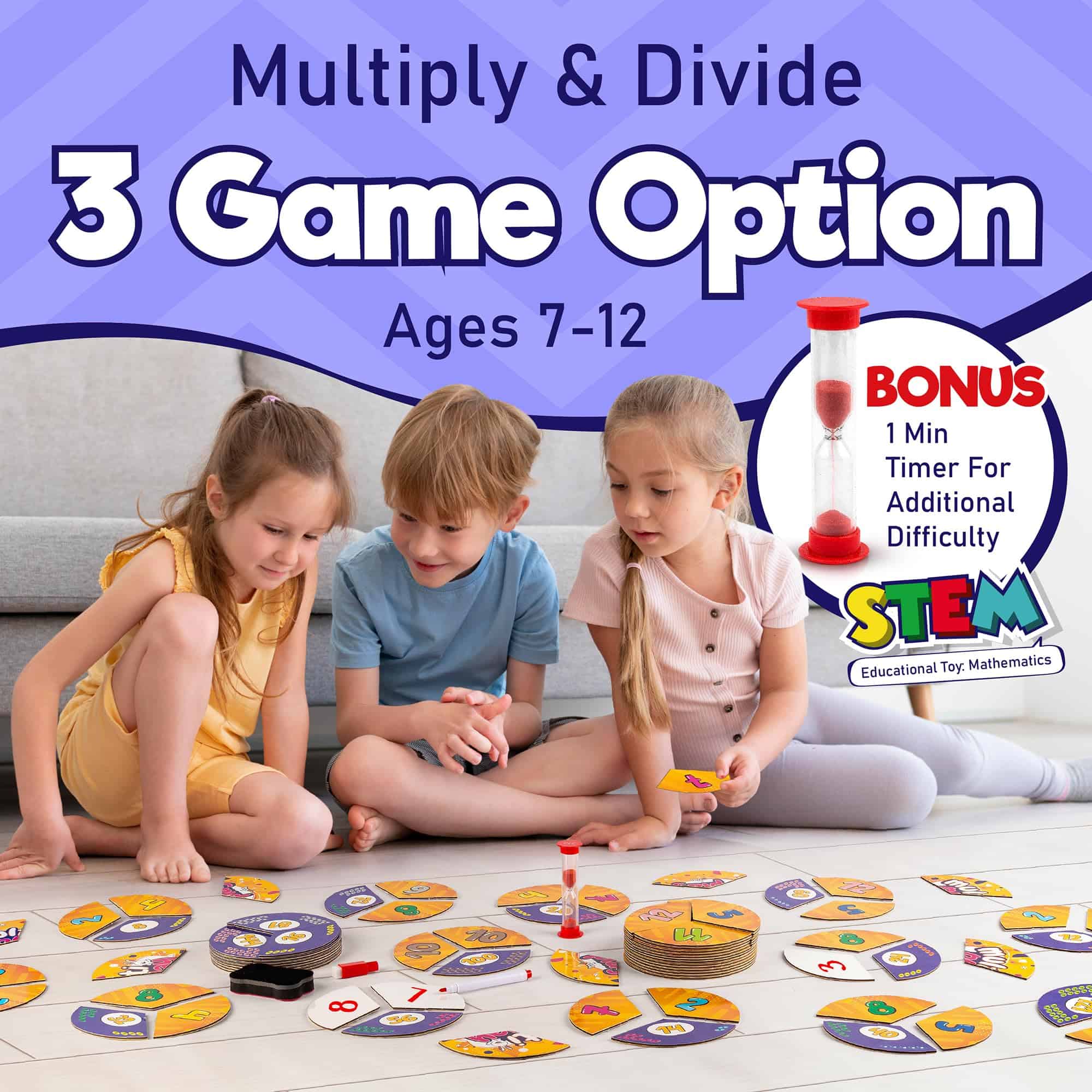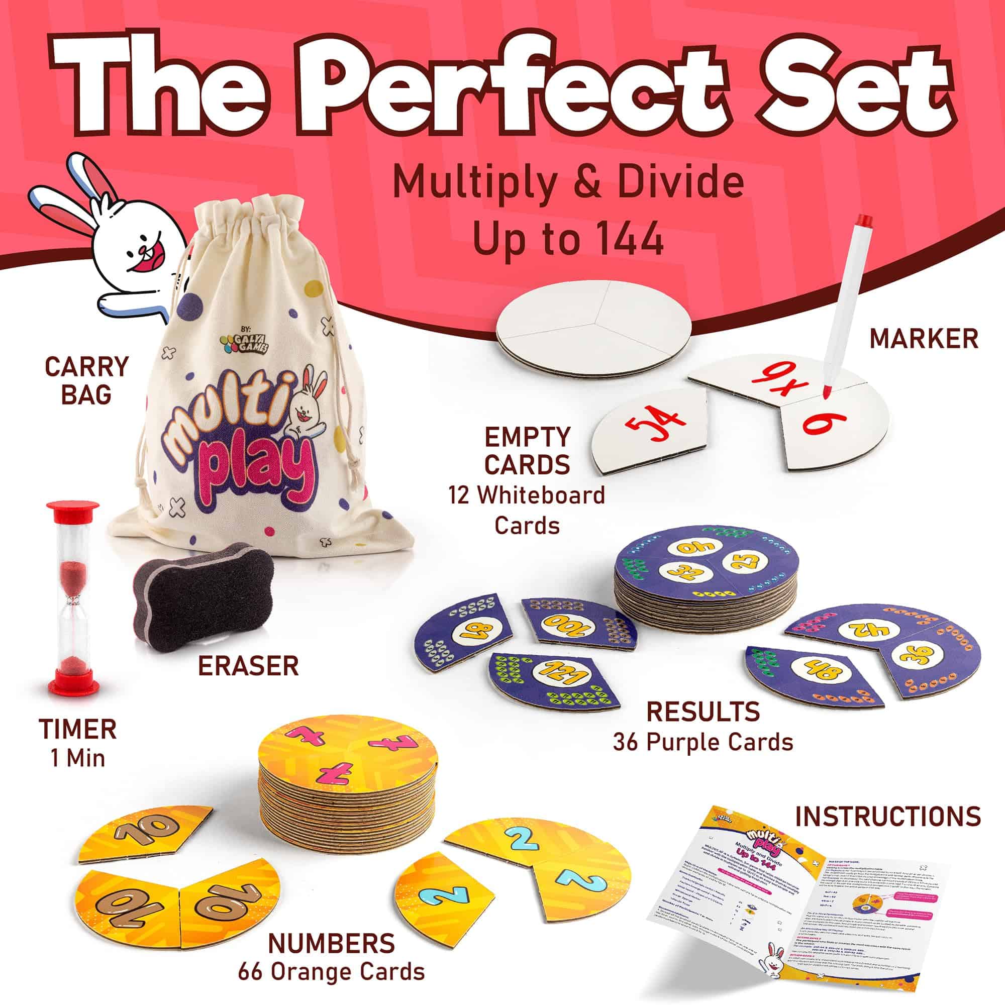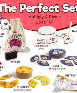 2. Set Completo: Incluye 66 tarjetas de juego de multiplicación naranjas, 36 tarjetas de división moradas y 12 tarjetas de pizarra.