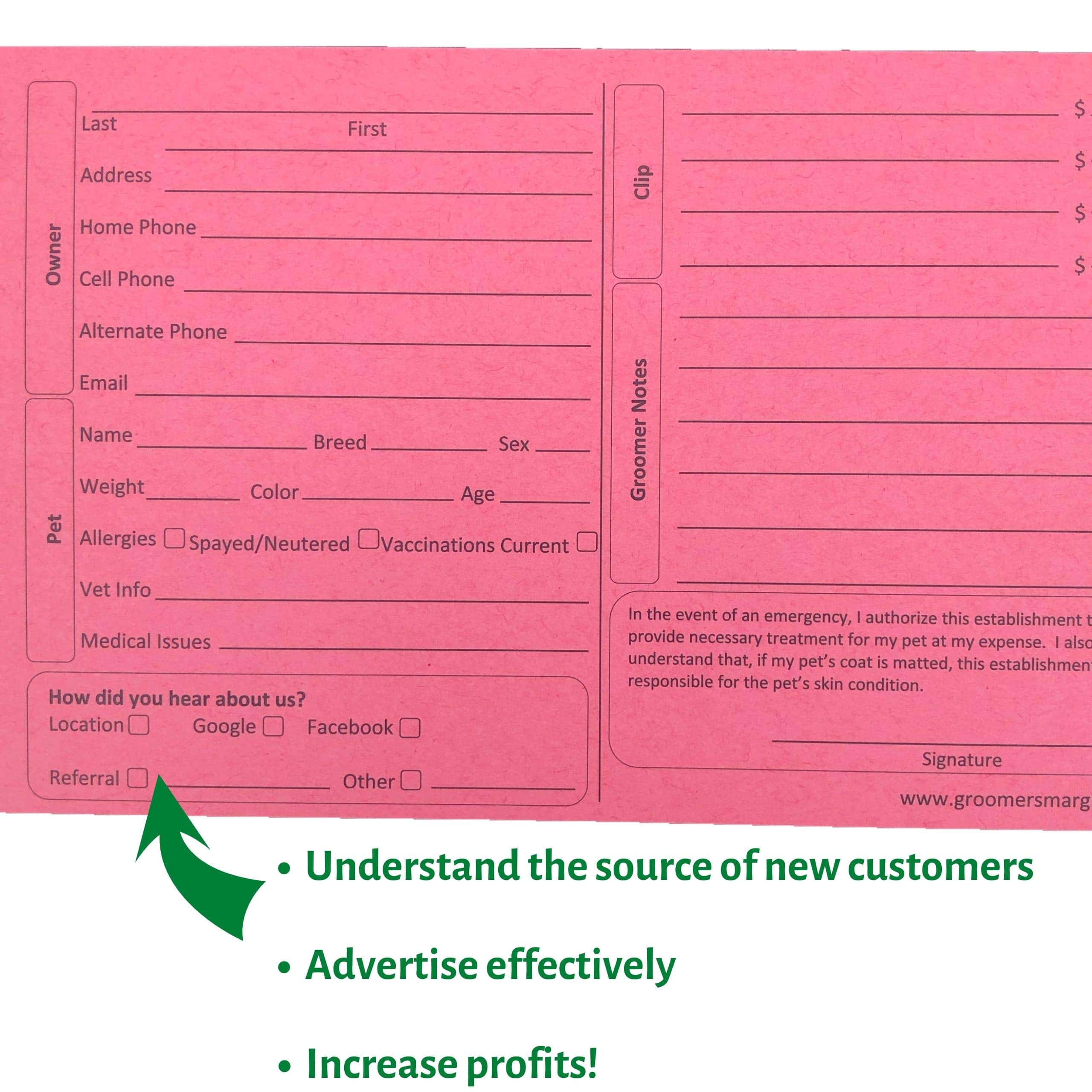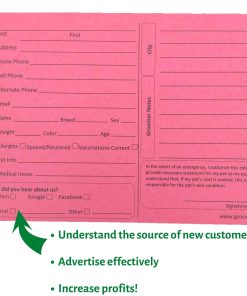 Nuestras tarjetas de perfiles de 5 por 8 pulgadas con márgenes Groomers para peluqueros de perros están ordenadas de forma clara para que los clientes de tu salón sepan qué áreas completar. En la parte inferior de estas tarjetas de clientes para peluquería canina hay un recuadro para que los clientes indiquen dónde escucharon acerca de tu tienda para que puedas saber qué publicidad funciona o no. La parte trasera de estas tarjetas de información para el cuidado incluye 26 líneas para registrar visitas de mascotas. Eso es un 70+% más de líneas que otras tarjetas, lo que debería ahorrarte dinero. Además de peluqueros y bañadores, es ideal para perreras, estilistas de mascotas, veterinarios, refugios, instalaciones de cuidado y centros de adopción.