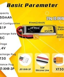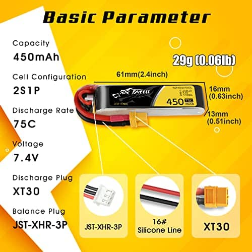 1. Tattu 7.4V 450mAh Batería LiPo Especificación Voltaje de la batería 7.4V Configuración 2S1P Capacidad 450mAh Descarga: 75C Enchufe: Enchufe XT30.