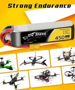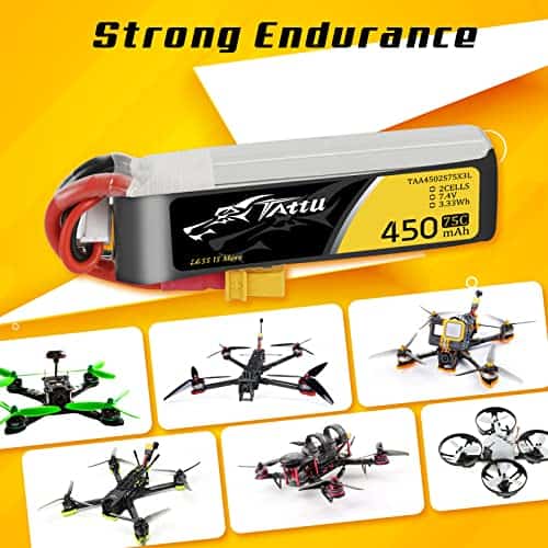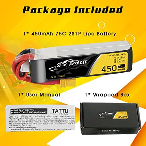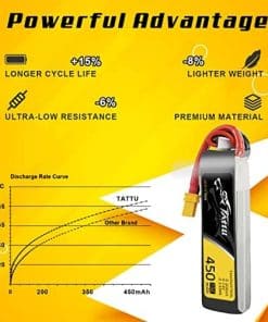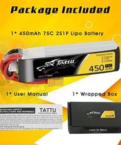 3. Alto Rendimiento: La batería Tattu 2S 450mAh Lipo con tasa de descarga de 75C en carcasa dura ofrece alta potencia y tiempo muy largo para su modelo RC.