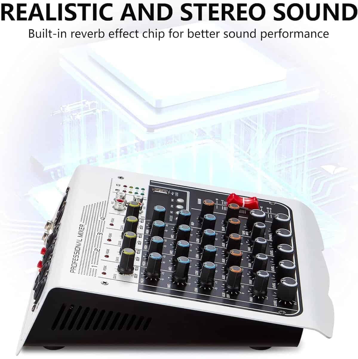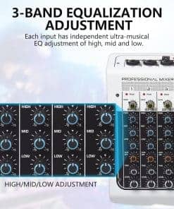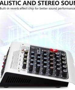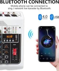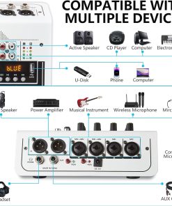 Este mezclador de audio de 6 canales es ideal para usar en escenarios, entrevistas, transmisiones en vivo en línea, grabaciones en estudio o para organizar noches de karaoke en casa. Cuenta con control de volumen y ganancia independientes para cada canal, lo que te brinda un control completo sobre tu mezclador de audio. Disfruta de efectos analógicos como reverberación y mejora tu sonido. Además, incluye una fuente de alimentación phantom de +48V confiable que garantiza suficiente potencia para tus dispositivos. Compatible con dispositivos Bluetooth y permite la transmisión de música de alta calidad desde smartphones, tablets y portátiles.