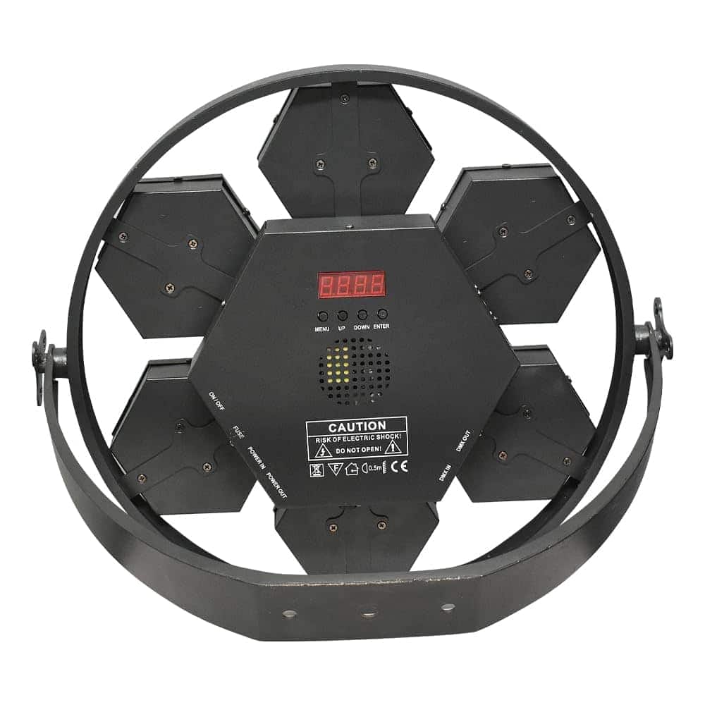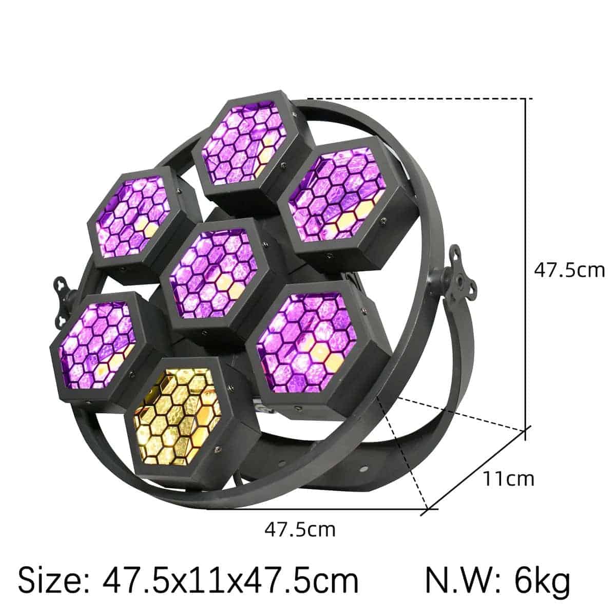 La luz de escenario está compuesta por 7 luces hexagonales retro con colores brillantes y alta luminosidad. La potencia máxima de 300 vatios de ultra brillo puede iluminar el escenario y escenas interiores. LED RGBW&CBO Cada lámpara está compuesta por 9 cuentas de lámpara RGBW 4 en 1 y tiras de luz cálida COB de 50W. Esta lámpara par tiene las características de protección ocular y una iluminación más natural. La combinación LED+CBO puede producir efectos de iluminación ricos y coloridos. Múltiples Modos de Control Esta luz LED uplight soporta múltiples modos de control, incluyendo DMX512 (8CH/32CH), activación de sonido, control maestro-esclavo y modo automático. Puede aplicarse a diversos escenarios de uso y es fácil de controlar. Multi escena La iluminación retro puede servir como iluminación de fondo del escenario, realzando los colores de todo el escenario. Se puede colocar en el suelo o instalarse en un soporte, adecuado para actuaciones en vivo, DJs, fiestas, bodas, iglesias y cualquier otro lugar popular de transmisión en vivo.