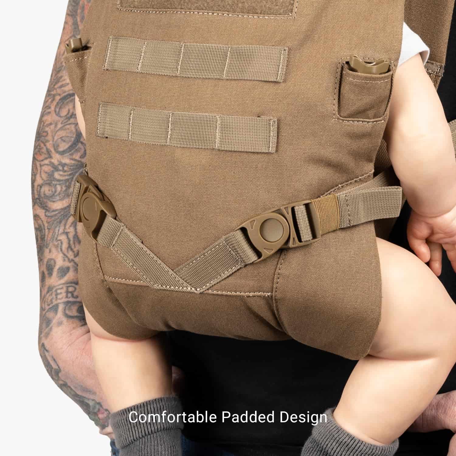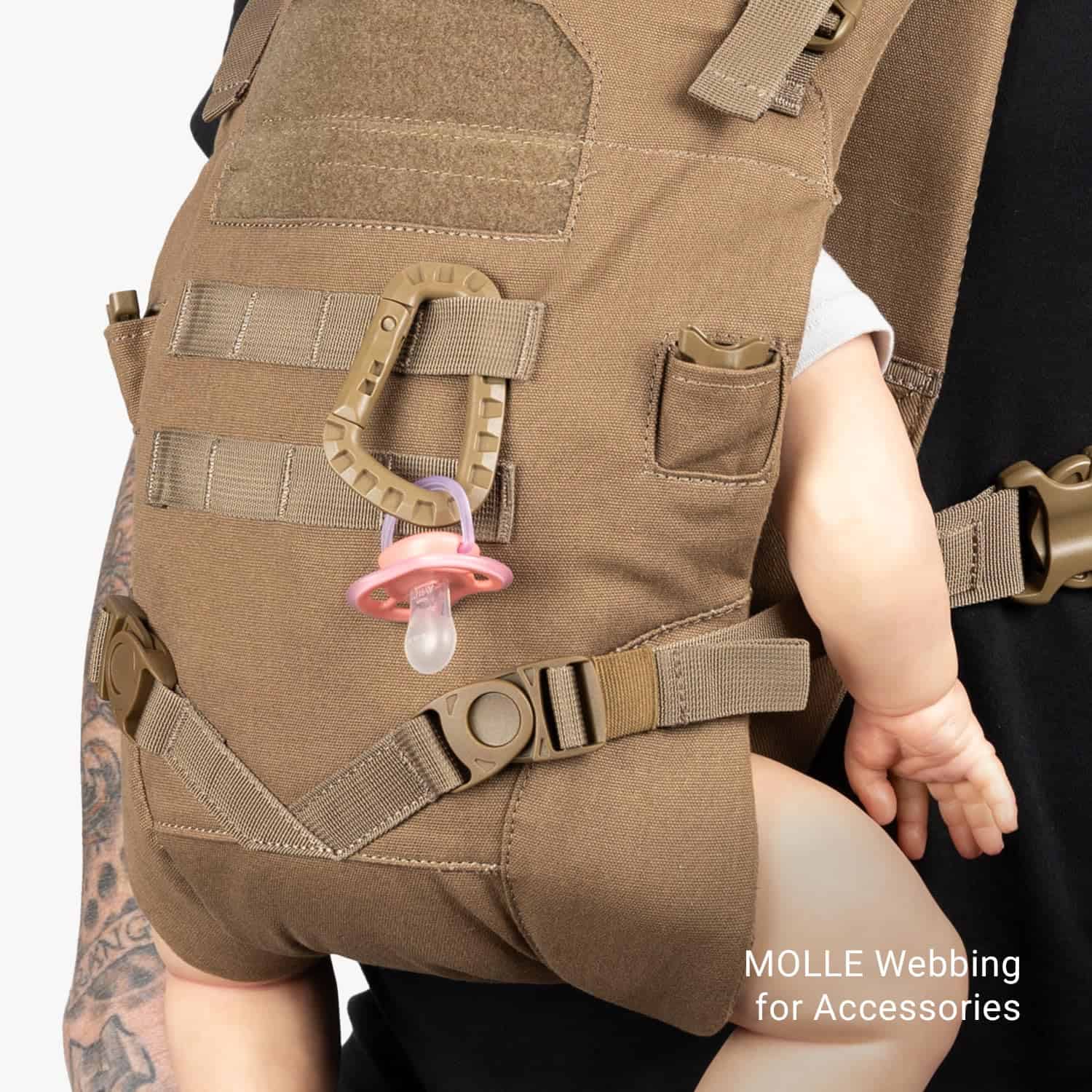 Diseñado con destreza táctica, preparado con MOLLE y eficiencia militar, el Portabebés Táctico está construido para padres en una misión. Al igual que todo el equipo firme de Tactical Baby Gear, este portabebés frontal de alta calidad te ofrece un rendimiento parental manos libres como nunca antes. Está equipado con correas MOLLE para que puedas combinarlo con todo tipo de accesorios, incluidos nuestros bolsillos compatibles y mosquetones. Asegúrate de que todo tu equipo esté al alcance de la mano con este superinteligente portabebés para papás de hoy. Nuestro portabebés está hecho de material ultra resistente de 600 deniers con un panel frontal de ‘hook and loop’ que puedes personalizar con parches (se venden por separado) y otros accesorios. También tiene un forro de algodón extraíble y lavable que hace que la limpieza post-explosión sea pan comido, además de hebillas UTX de alta resistencia que simplifican el enganche. Presenta un estilo ‘un and done’ para adaptarse a bebés de 8 a 33 libras y puede llevar al bebé mirando hacia adentro o hacia afuera, según su etapa de desarrollo. Tu preciosa carga puede comenzar a mirar hacia afuera cuando sea lo suficientemente mayor para sostener adecuadamente la cabeza. Disponible en Negro, Coyote Brown, Ranger Green y Black Camo. El Portabebés Táctico de TBG cumple con los requisitos de seguridad para portabebés establecidos por ASTM F2236-13 y CPSIA.