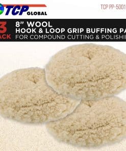 Almohadilla de Lana de 8″ 100% con Gancho y Bucle: Almohadilla de pulido de lana diseñada para un corte, pulido y encerado efectivos de pintura oxidada, piel de naranja, rayones profundos y barnices claros utilizando compuestos automotrices. Ideal para corregir superficies automotrices versátiles: ideal para abordar pintura oxidada, piel de naranja, rayones profundos y rayones de lijado de color en capas superiores duras y barnices claros. Refuerzo de respaldo para mayor durabilidad: cuenta con un respaldo de plástico curvado y reforzado en los bordes internos para una acción de pulido más suave y una vida útil de la almohadilla extendida. Agarre seguro para placas de respaldo: el accesorio de agarre de la almohadilla asegura una conexión firme a las placas de respaldo de gancho y bucle de hasta 7 pulgadas. (Placas de respaldo disponibles por separado TCP BP-5172).