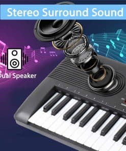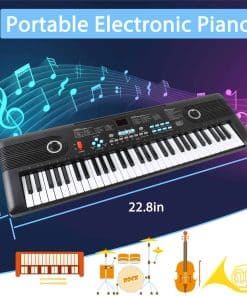 Piano electrónico de 61 teclas blancas y negras, fabricado en plástico y componentes electrónicos.