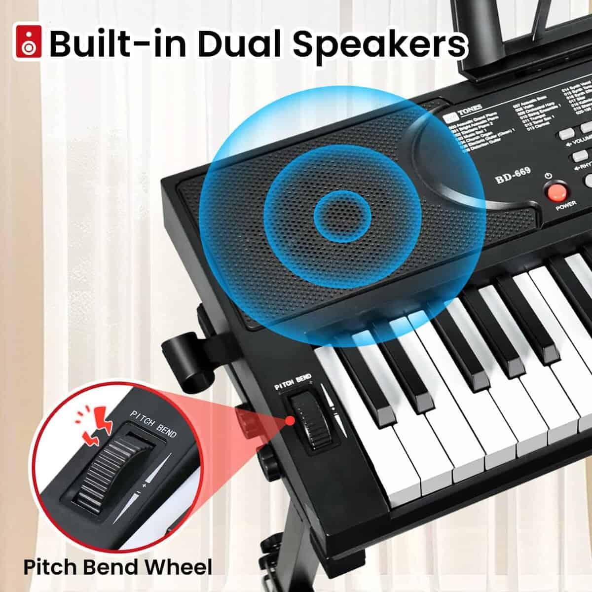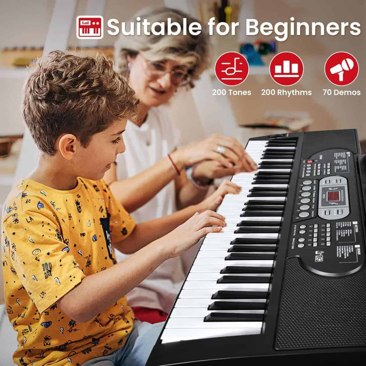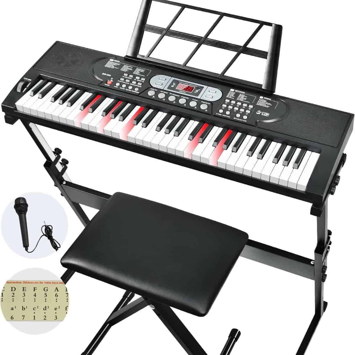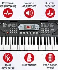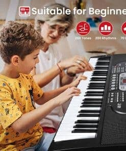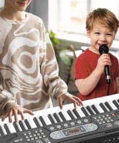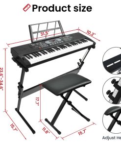 1. Teclado de piano premium – El teclado de piano de 61 teclas de JTSIOV imita la textura de un piano tradicional, proporcionando un toque realista ideal para niños y principiantes. El set de teclado de piano incluye un soporte de piano y una banqueta ajustables, atril de música y micrófono, asegurando comodidad y conveniencia al tocar.