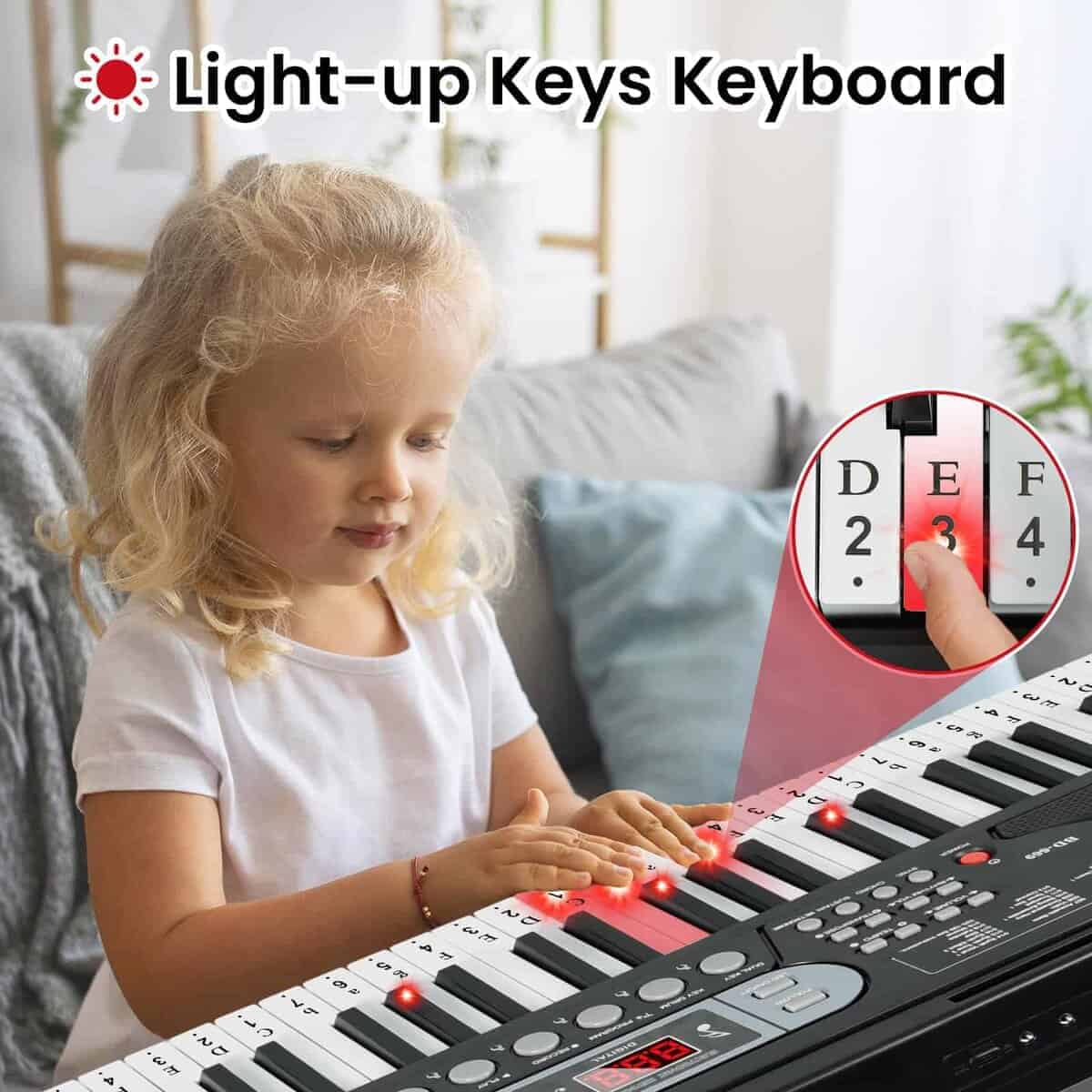 2. Función de enseñanza – El teclado de piano iluminado y las pegatinas de teclado de piano pueden ayudar a los principiantes a aprender las posiciones de las escalas de manera eficiente. El teclado de piano incluye una biblioteca de 70 canciones demo y ofrece una gran cantidad de material de práctica, utilizando el modo Seguir se puede tocar junto con las canciones demo, cultivando el amor por la música.
